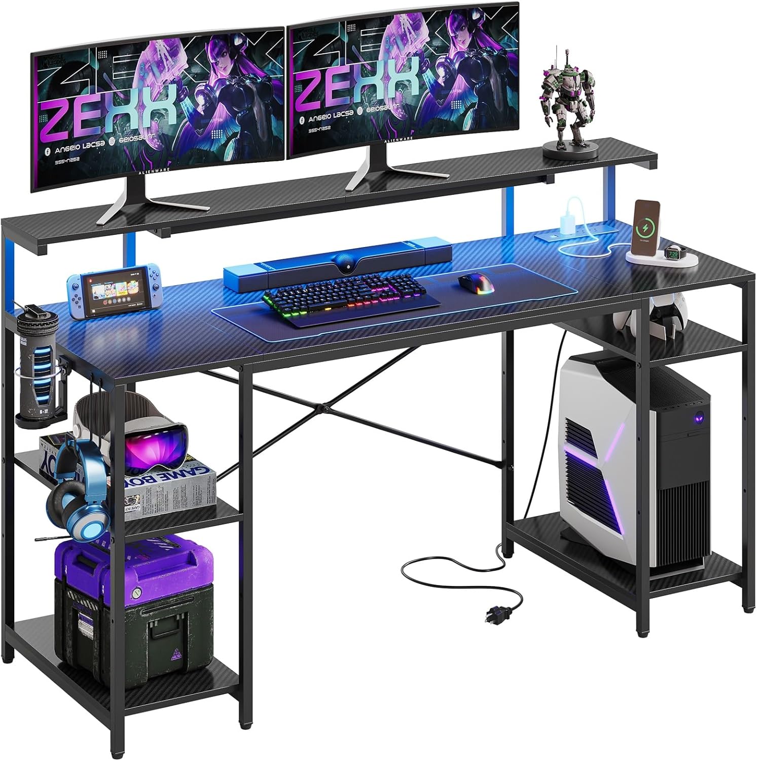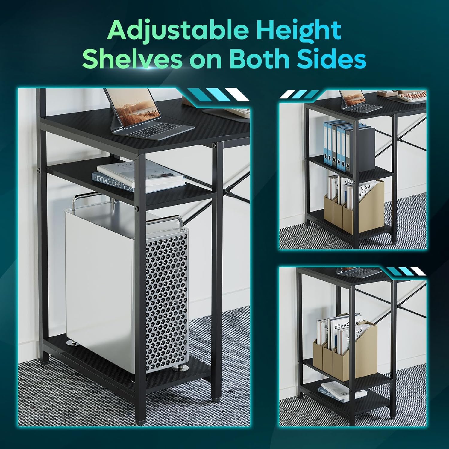 【Flexible Storage Space】This desk with shelves comes with 2 adjustable height shelves, left and right interchangeable foldable cup holder and headphone hook. The shelf on both sides can be adjusted to 3 different heights, allowing you to place your CPU, low file basket, PS5, gaming devices, etc, saving space on your desktop and providing you with a comfortable environment for gaming or working.