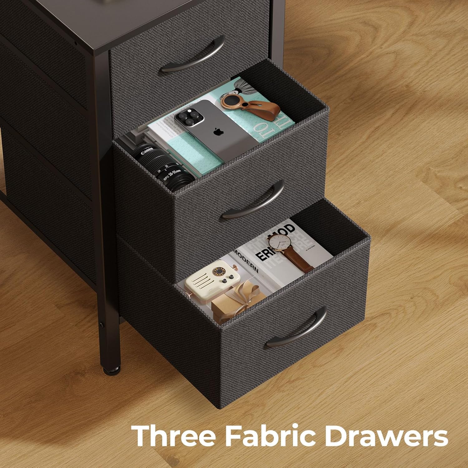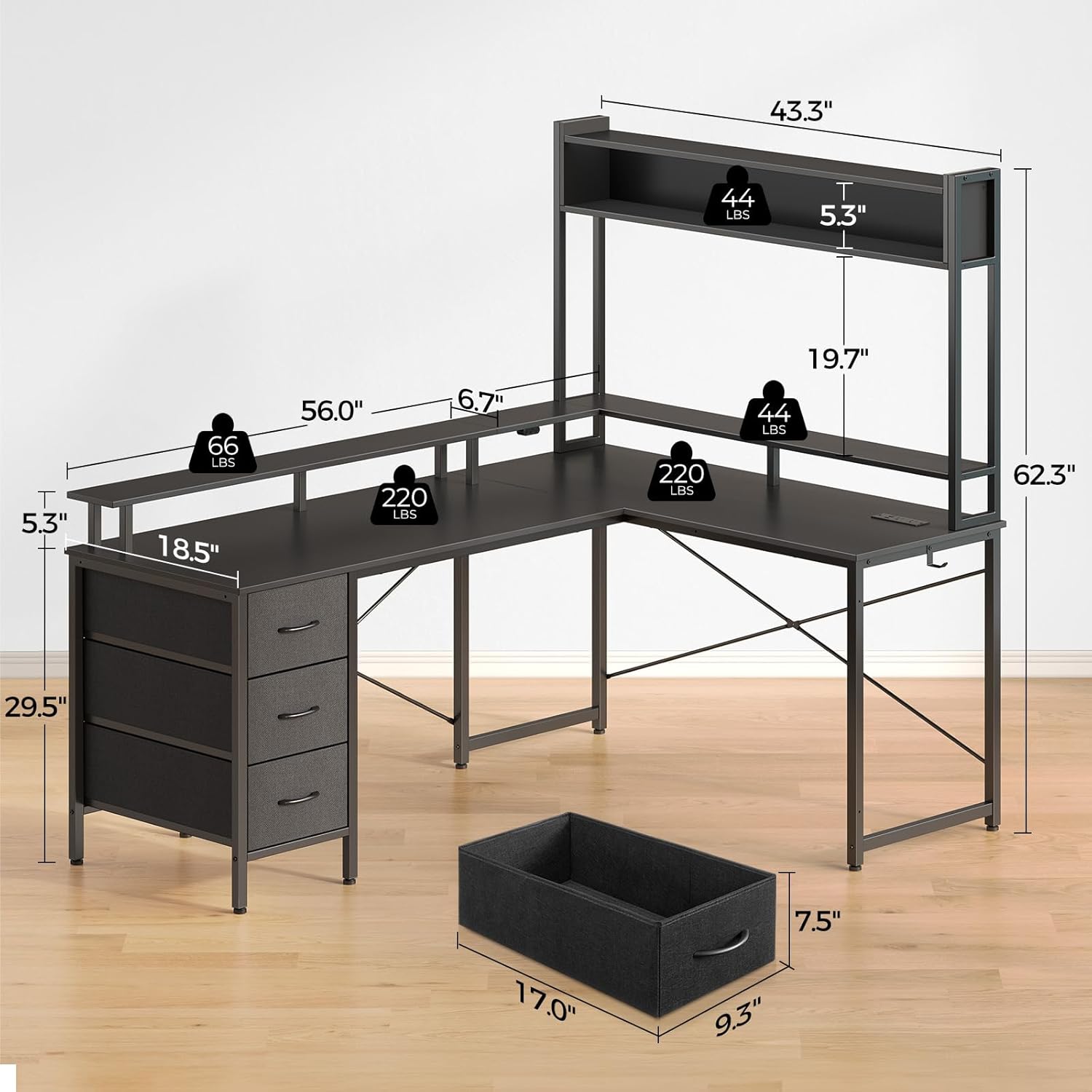 Abundant Storage Capacity: This computer desk comes with top hutch and 3 spacious drawers made of high-quality non-woven fabric,which maximally utilize your home office space and provide enough space to place files, books and ornaments within easy reach. Two large tabletops of 56″ and 43.3″ in different lengths can offer ample space for 3 monitors or screens, gaming activities, home office work, and other activities