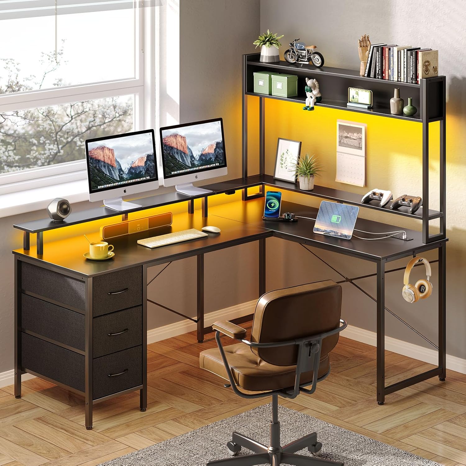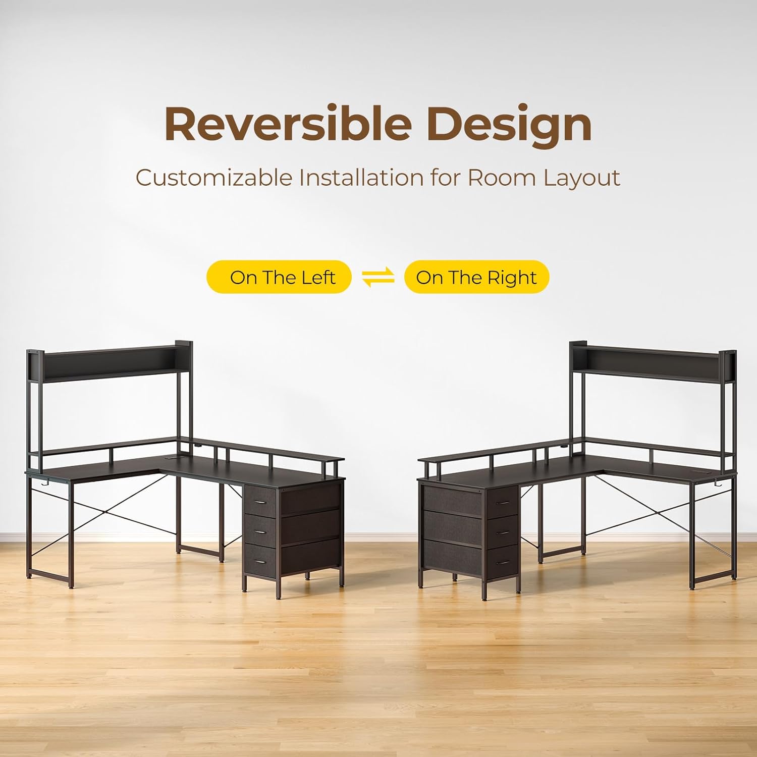 Reversible Computer Desk: Our L-shaped desk offers a flexible solution with a reversible design, allowing you to customize the placement of the storage drawers on the left or right based on your preferences, providing convenient adaptability to suit your usage habits