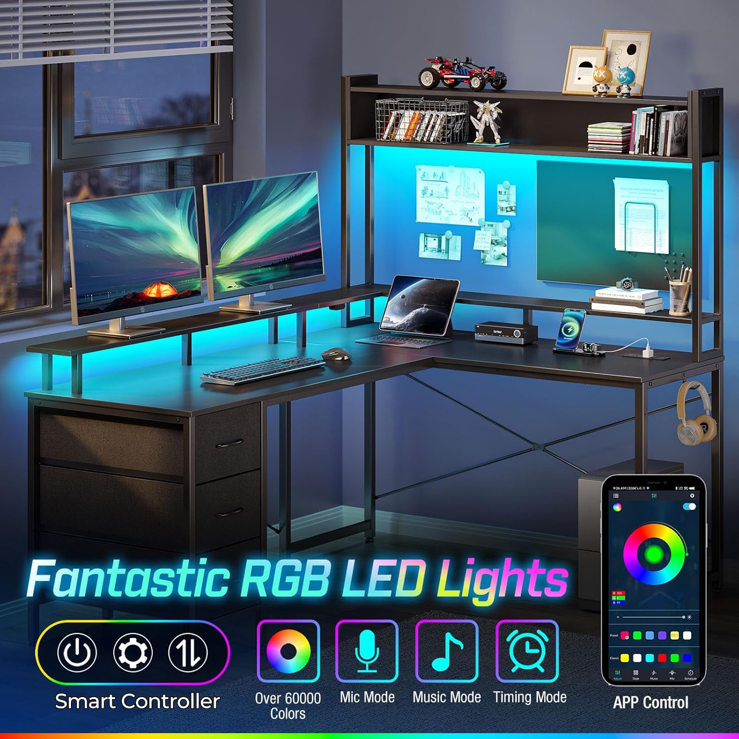 Experience Gaming in a Whole New Way: Elevate your gaming experience with this feature-packed desk. This gaming desk comes with customizable multi-color RGB LED light strips that offer 60,000 colors to choose from. You can control the colors, brightness, mode, and timer settings using a phone app or controller. The LED lights can also dance to the beats of your music, letting you immerse in a romantic and energetic gaming atmosphere