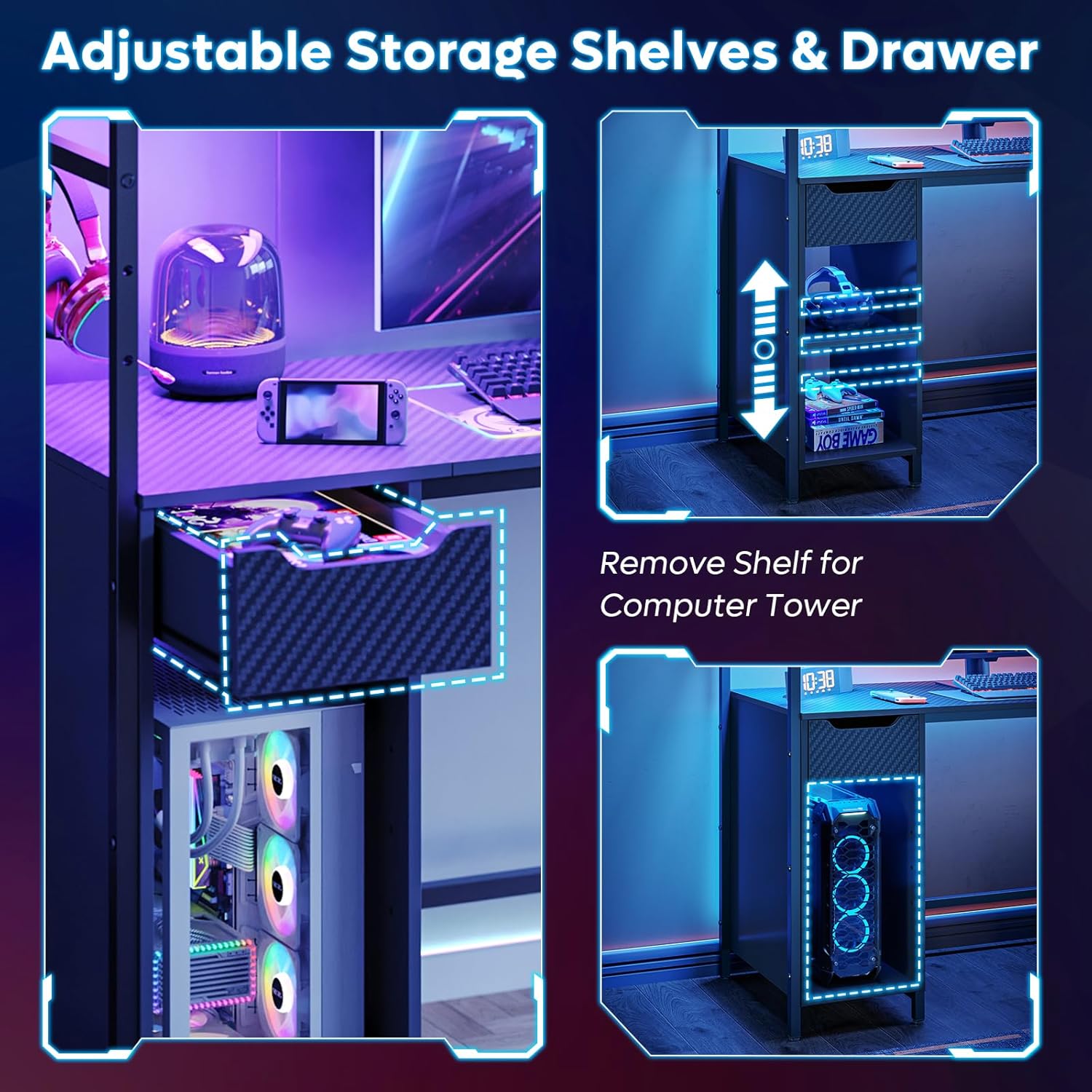 【Adjustable Shelf & Storage Drawer】This gaming computer desk is designed with a drawer and a semi-enclosed storage area, featuring an adjustable shelf. The adaptable design allows you to remove the shelf to accommodate a computer host or keep it installed to create two tiers of storage, perfect for organizing speakers, books, game controllers, and more. This upgraded storage solution ensures your desk stays clutter-free while offering space for items of various heights