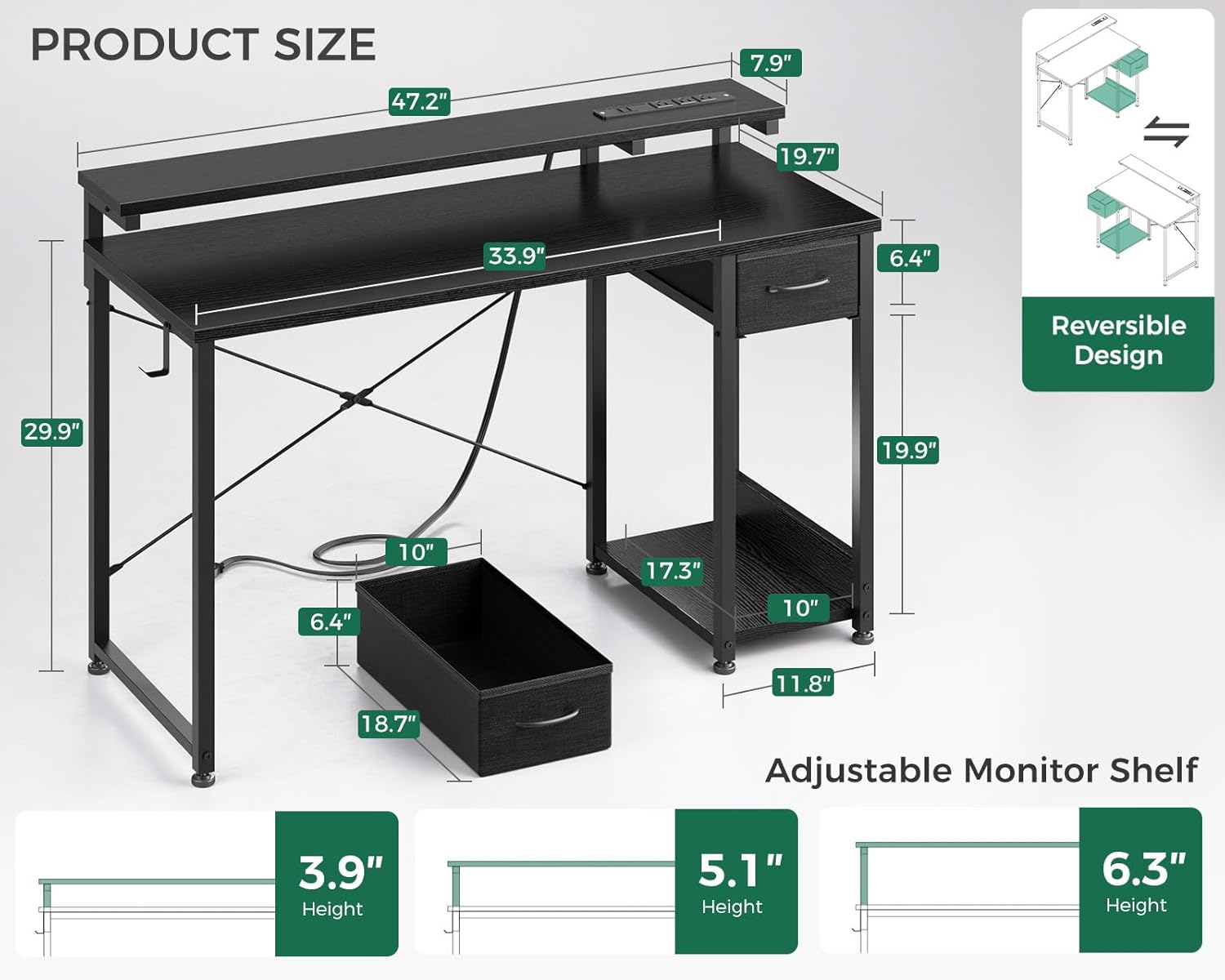 【Fabric Drawer & Reversible PC stand】The drawer made of fabric is ready to use and easy to clean. It offers a private space for storaging your goods. The shelf below the desktop can be assembled at left or right for your convenience. A headphone hook is equipped on the other side of the desk.