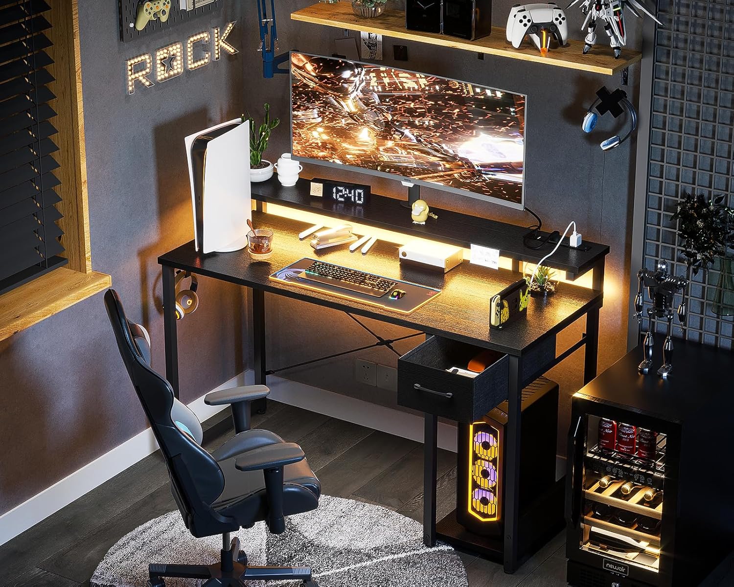 【Desk with LED Lights】Our gaming desk is equipped with a RGB LED strip lights under its monitor shelf which offers 10 static colors and 10 dynamic modes. You can freely switch between different lighting colors by pressing the button, according to your mood or the specific usage scenario. Whether you are gaming, live streaming, or daily working, it adds a vibrant atmosphere to your room, enhancing your overall experience.