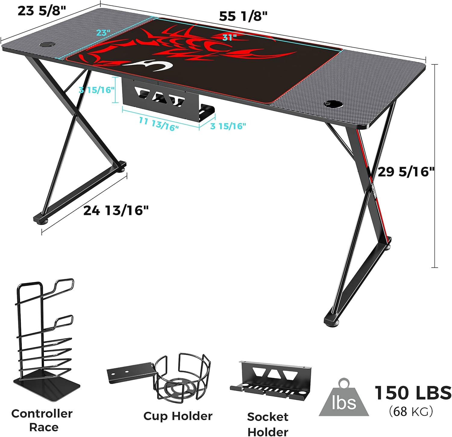 Product Name: Eureka Gaming Captain X Series 55” E-sport Desk Color: Elegant Black Bearing Load: 90LBS Materials: P2PB/ABS/Carbon Steel Net Weight/Gross Weight: 39.24lbs/49.16lbs Product Measurement: 55.12”x23.62”x29.33” Packing Measurement: 31.89”x27.05”x8.27”
