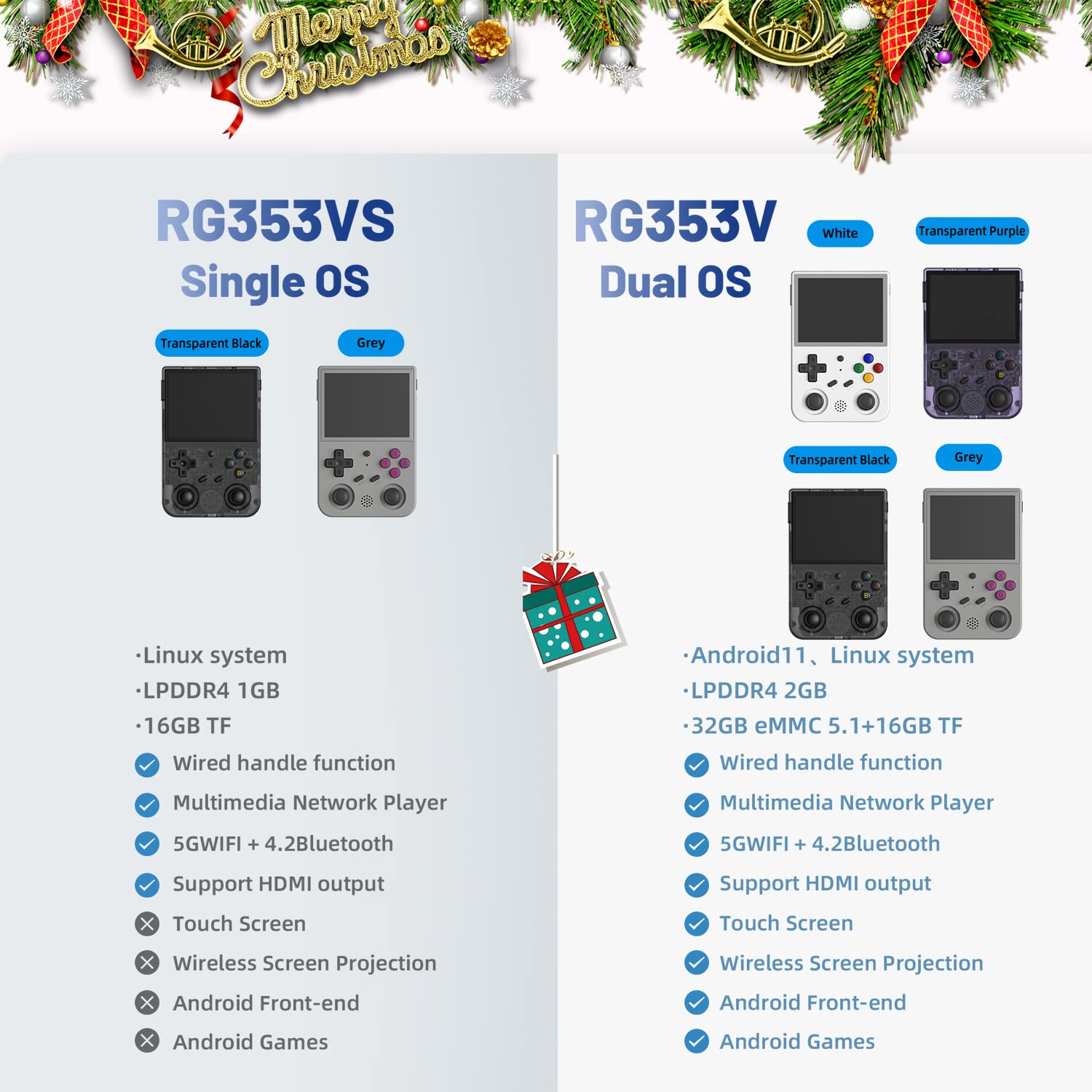The main difference is single or dual system. RG353V Game Console with Android 11, LINUX, RG353VS Game Console with Linux System RG3566