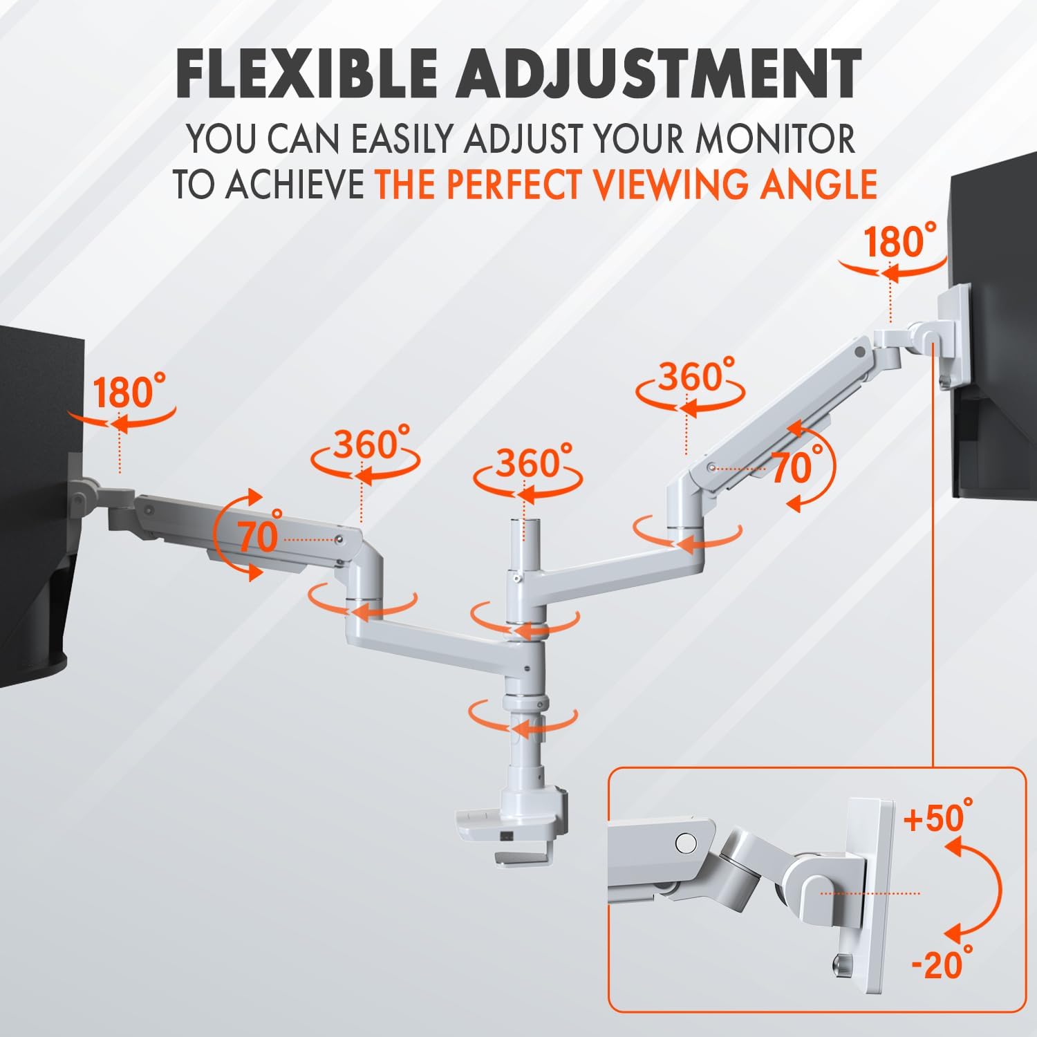 Versatile Dual Monitor Arms – Supports a variety of monitors including flat, wide, curved, and ultrawide. Features dual monitor arms capability for side-by-side monitor setup, enhancing workspace productivity and viewing experience.