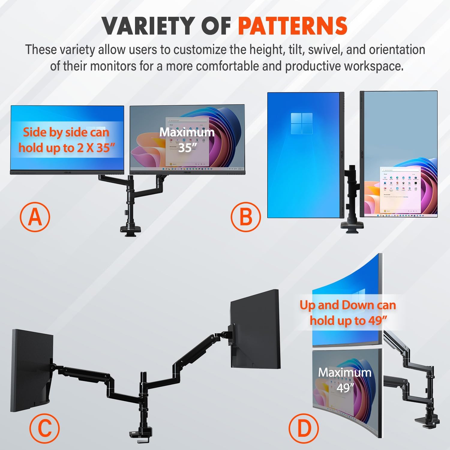Ergonomic Articulating Dual Monitor Mount – Accommodates monitors up to 49 inches and 44 lbs., with full 360° rotation, swivel, and tilt functions. Its ergonomic design is key for reducing neck and eye strain.