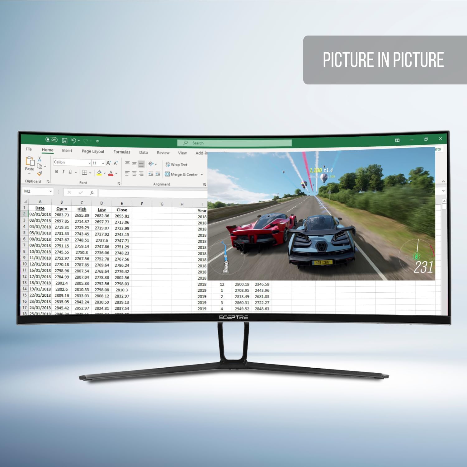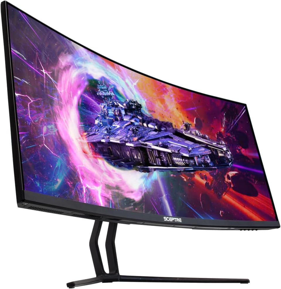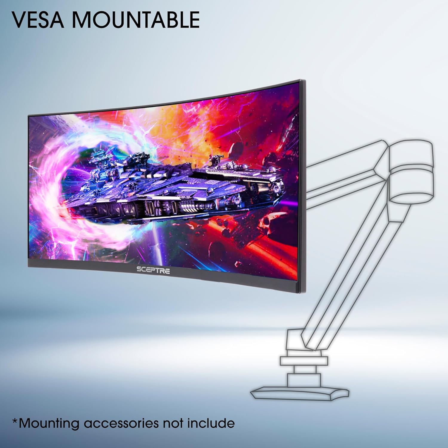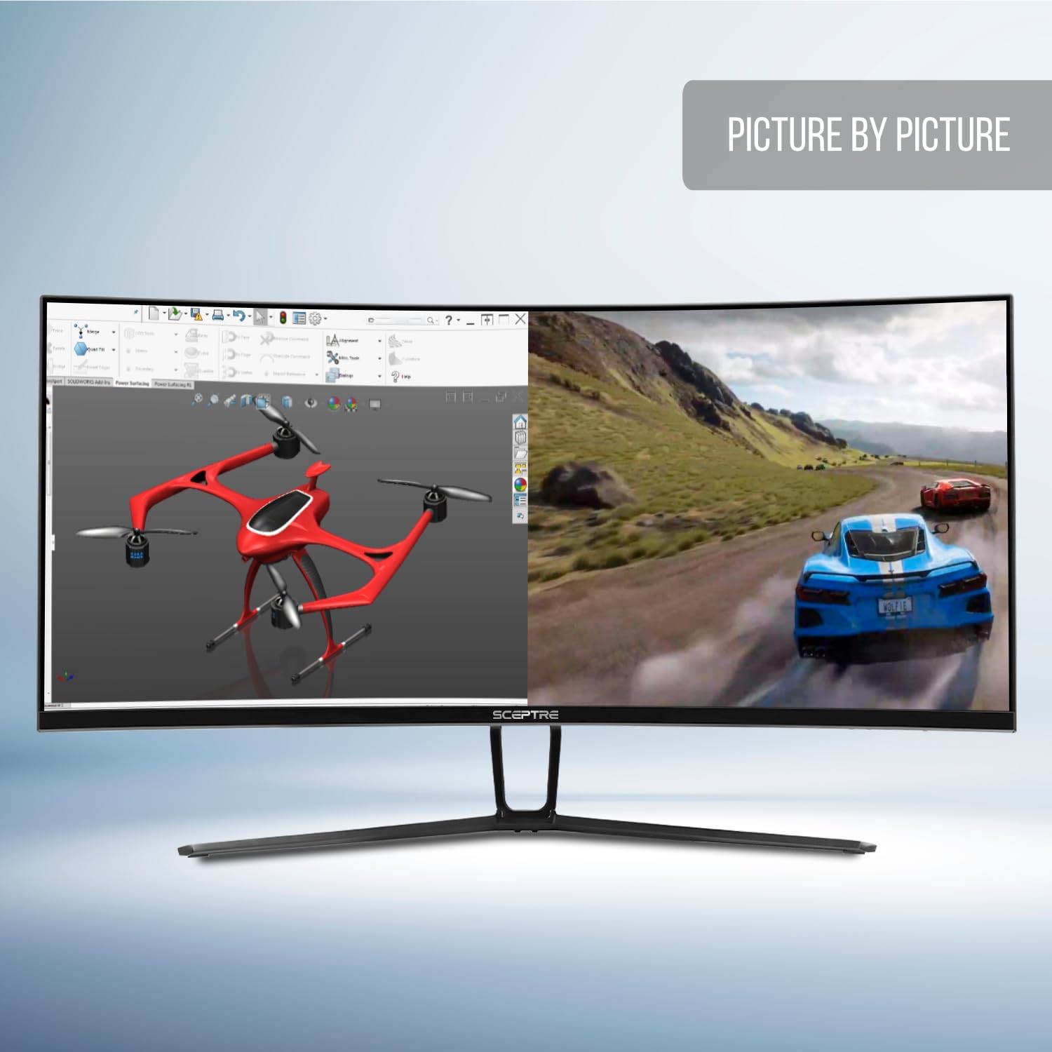 Sceptre’s C355W-3440UN 35-inch 100Hz Curved Monitor – Exceptional Work, Dominant Play. Sceptre’s C355W-3440UN is an UltraWide QHD display designed for quality entertainment experiences. With 100Hz high refresh rate, better gaming sessions are in your future as it provides a clear visible advantage in competitive environments. Captivate and immerse a larger audience with Sceptre’s 35-inch 21:9 UltraWide curved monitor. With an 1800R curved design that accurately resembles the contours of the human eye, a better gaming session is in play. By closely mirroring the shape of the human field of vision, an unprecedented level of clarity and immersion is delivered, while reducing the amount of strain on your eyes. Equipped with Blue Light Shift technology, reduce the amount of blue light being emitted from your monitor so you can game and work longer with more comfort, without straining your eyes. Powered by a VA (Vertical Alignment) panel that delivers advanced refresh rates, sharper contrast ratios, and stellar viewing angles, these assets make this panel ideal for gaming and artistic pursuits. With an LED Display that delivers sharper contrasts between lights and darks while delivering a vast array of rich colors, a more pleasing experience is delivered. With a 320 cd/m² brightness, being able to detect subtle and robust color variations has never been easier, and comes in handy when working on creative projects. Multitasking has never been easier with the PBP and PIP features this monitor provides. PBP (Picture-by-Picture) enables the ability to separate the screen in half by displaying output from two different sources to the left and right sides of the screen. PIP (Picture-in-Picture) is also available for split screen, but differs as one source is displayed on the main screen at the same time another source displays in a sub window. By delivering exceptional clarity across every inch of our screen, this curved monitor eliminates the need for a dual monitor setup. Our 35-inch monitor also features AMD FreeSync™ Premium, providing gamers with smoother video and seamless on-the-spot movement in the fast-paced games by synchronizing the graphic card and monitor refresh rates in order to eliminate tearing and stuttering. With 100Hz refresh rate, images transition rapidly and smoothly while still outpacing the standard conventional monitor. Anti-flicker technology is also available to provide a crisper image by preventing the backlight from flickering periodically. FPS (First Person Shooter) and RTS (Real-Time Strategy), Sceptre’s custom set display settings for gaming, are also available for a more enhanced experience. Multiple ports are offered with HDMI 1 & DP 1 delivering up to 100Hz and HDMI 2 & HDMI 3 delivering up to 60Hz refresh rates. Can’t find the right angle? With our tiltable design, find that sweet spot that bridges clarity and comfort for your daily computer usage. This monitor also features an aesthetic back cover equipped with LED lights to deliver a unique and modern design. With an equipped VESA wall mount pattern, enjoy the option of attaching the monitor to an articulating arm or mount on the wall for your ideal setup. With our edgeless design, gaming and entertainment has never looked so good.