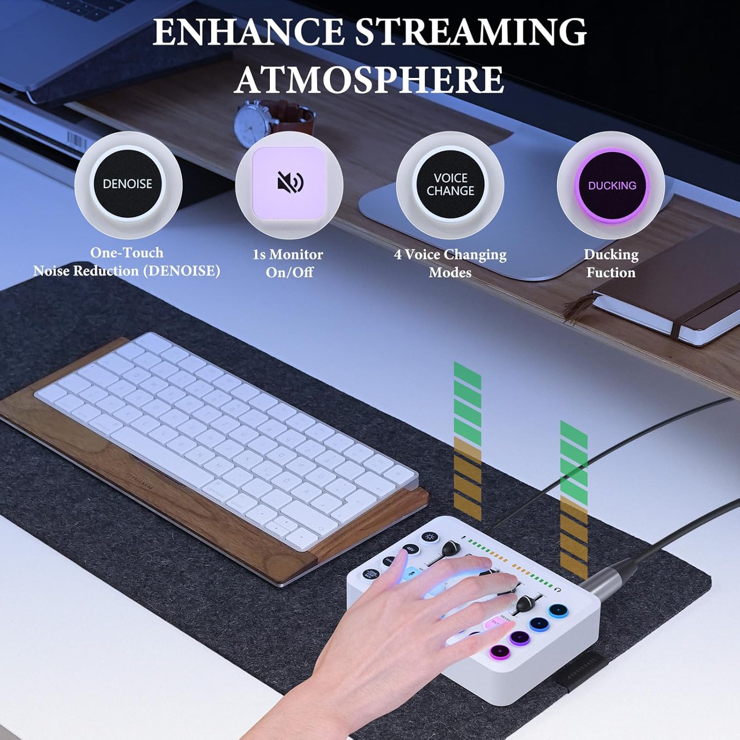 Mute and Monitor: Featuring mute and listen buttons, the mixer for streaming mutes audio to prevent background noise from ruining live broadcast. Control monitoring with the intuitive one-touch monitoring on/off button. Real-time feedback between speaking and listening without distraction.