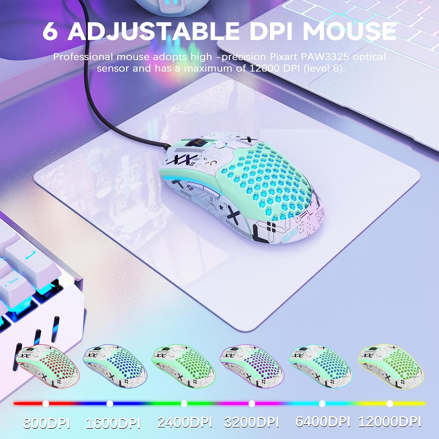 【6 LEVELS DPI】 This gaming mouse has 6 levels of adjustable DPI: 800/1600/2400/3200/6400/12000. High-precision Pixart PAW3325 optical sensor, ensure transmission stability and accuracy of analysis, enhanced game performance, compatible with 4K computer monitor. Switch life: 20million cycle