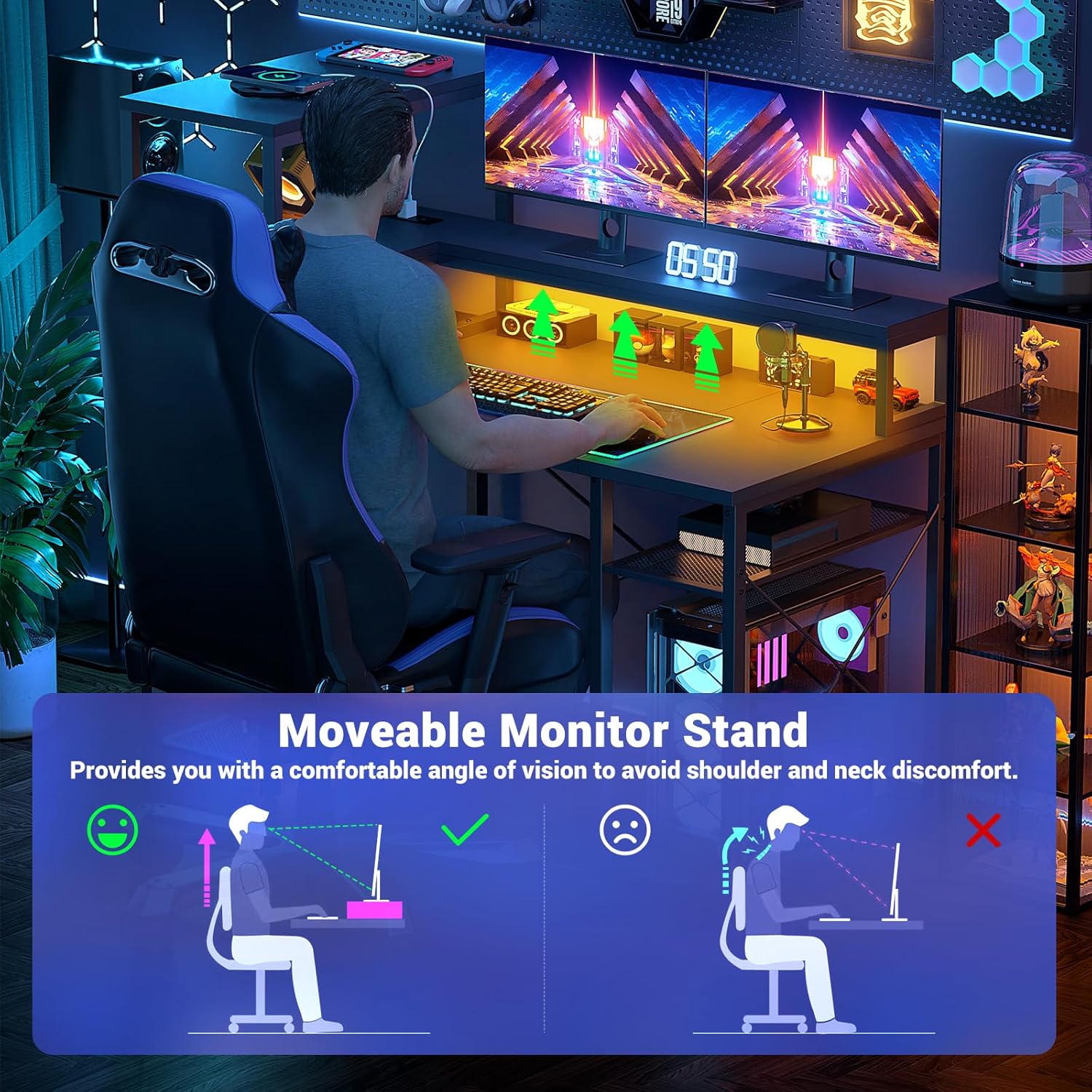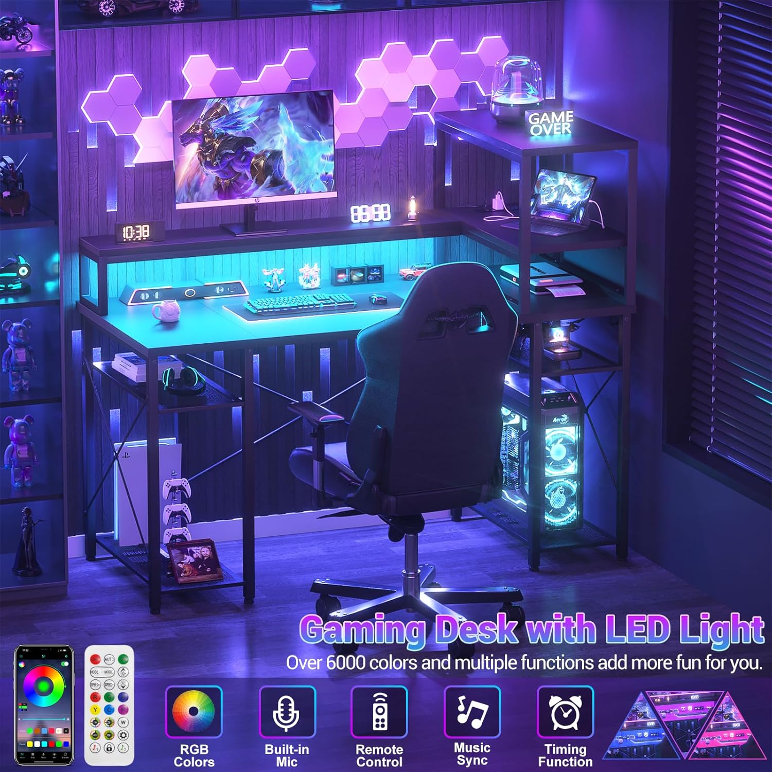 【Computer Desk with LED Light & Charging Station】PC gaming computer desk features a smart LED light that has over 6000 colors and multiple functions it can make the light change with the music frequency will provide you with a amazing gaming experience. 3 outlets and 2 USB ports for your various charging needs.