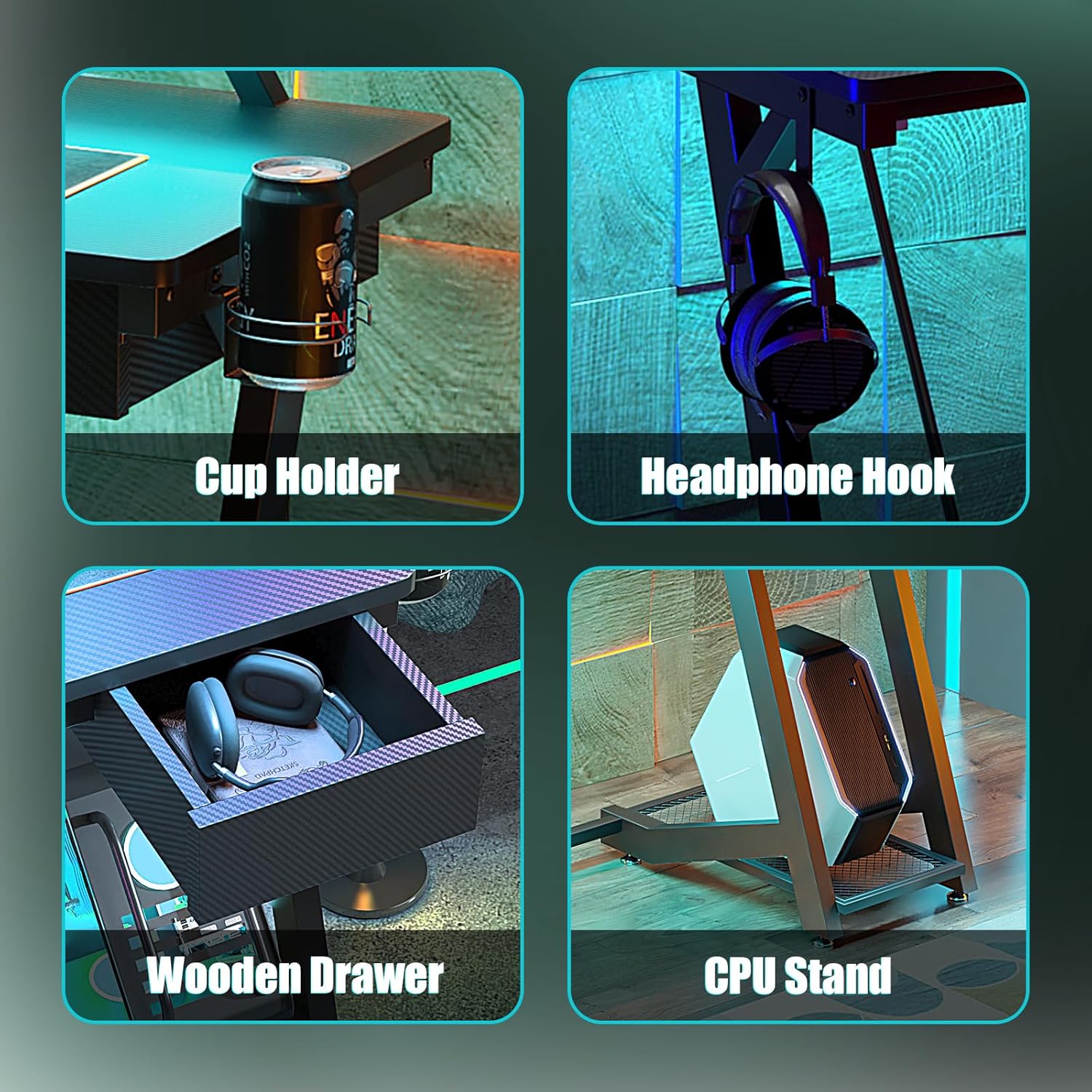 [CPU STAND& WOODEN DRAWER]: TREETALK GAMING Desk with large storage place, fashionable mesh CPU stand to keep your CPU from moist and dust,solid wooden drawer to store Gamepad, playstaion or books.Curved line innerside specially designed for the cord managament to keep your gaming desk clean and tidy.