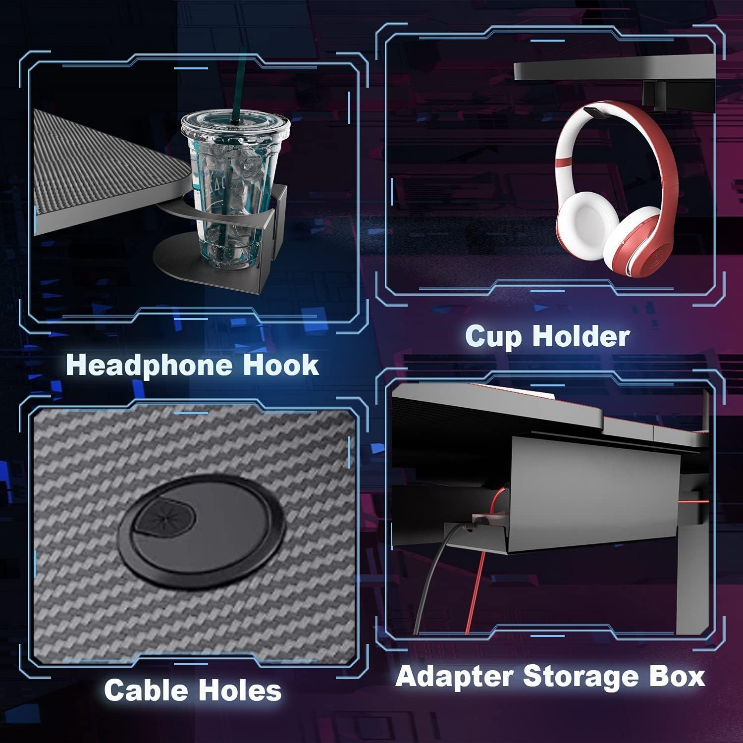 š®ćMultifunctional Gaming TablećGaming computer desk is built with luxurious functions, such as wire-management, rotating cup holder and headphone/VR headset hook compared to the basic computer desk.