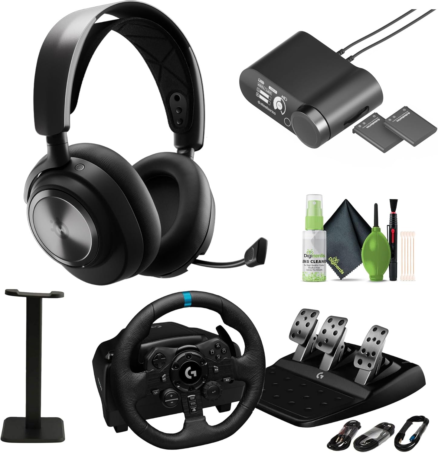 Bundle Includes: SteelSeries – Arctis Nova Pro Wireless Multi Gaming Headset for PC, PS5, PS4, Switch Mobile + Headphone stand – Black + Diginerds Cleaning Kit-7 in 1 + Logitech G G923 TRUEFORCE Sim Racing Wheel and Pedals for PC, PS4 & PS5