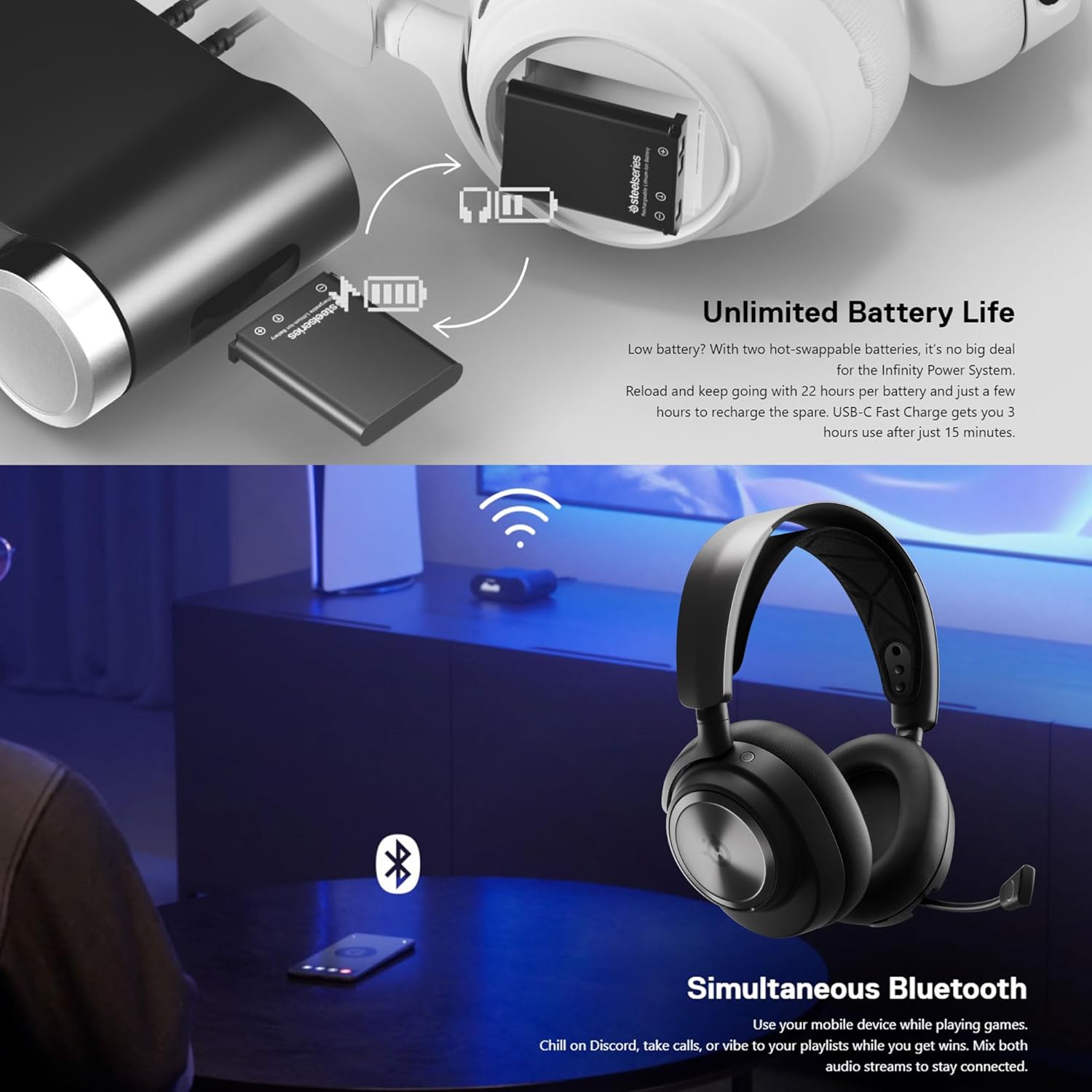 Infinity Power System for Unlimited Playtime: Never pause the action with two hot-swappable batteries providing 44 hours of gaming. SteelSeries Arctis Nova Pro Wireless Multi-System Gaming Headset’s Each battery lasts up to 22 hours and recharges in just 15 minutes for 3 hours of use. The fast-charging USB-C system ensures non-stop performance, perfect for marathon gamers or those who multitask across devices.