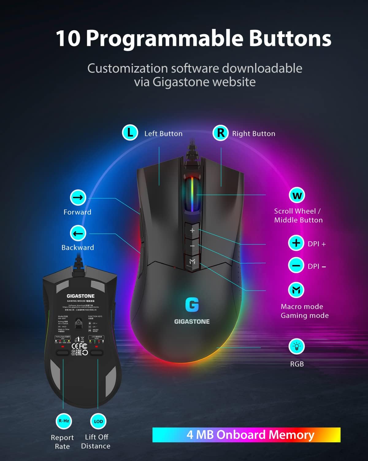 【Advanced Precision】 Pixart PMW3389 Sensor, up to 16,000 DPI with 5 adjustable levels and 10 programmable buttons for DPI, RGB, polling rates, and lift-off distance settings. DPI numbers could be customized further to suit your needs with Gigastone free software.
