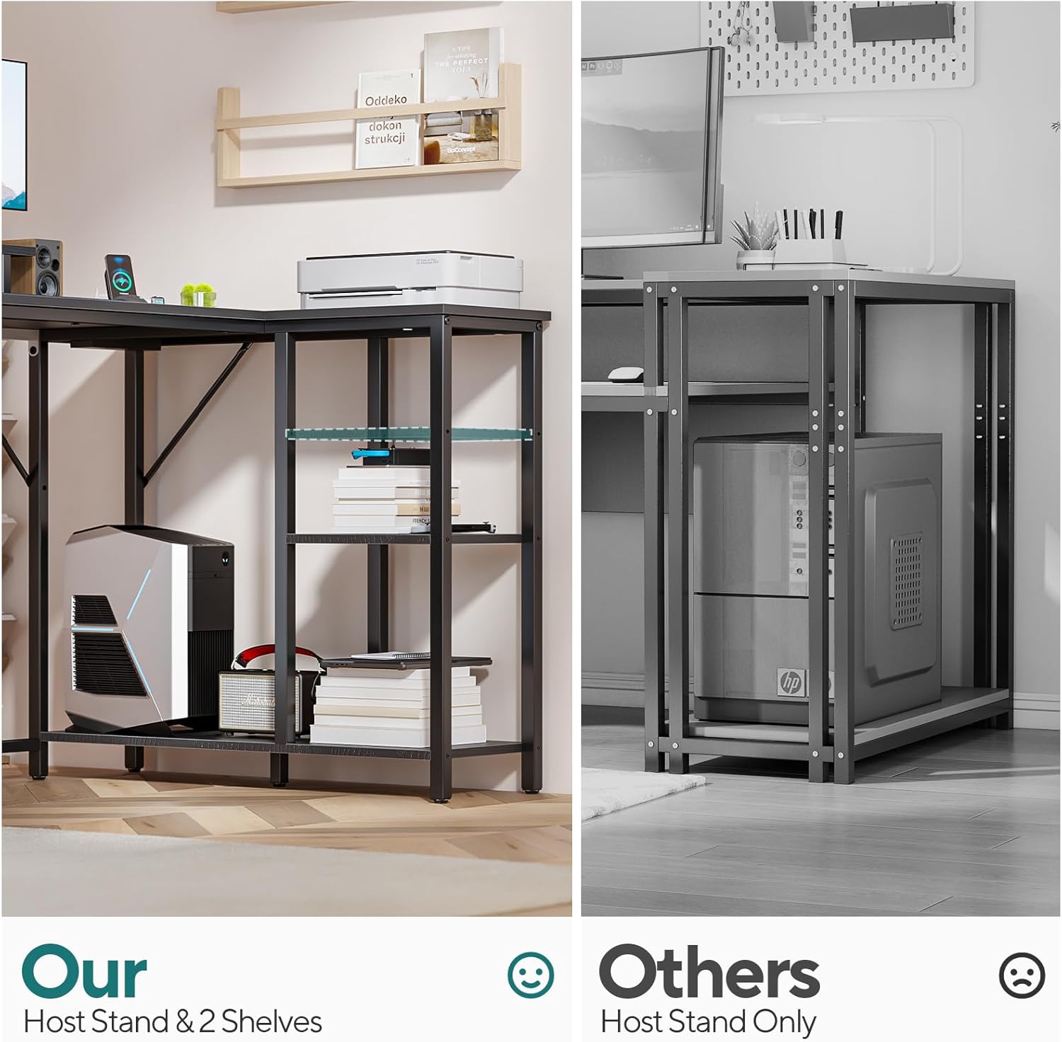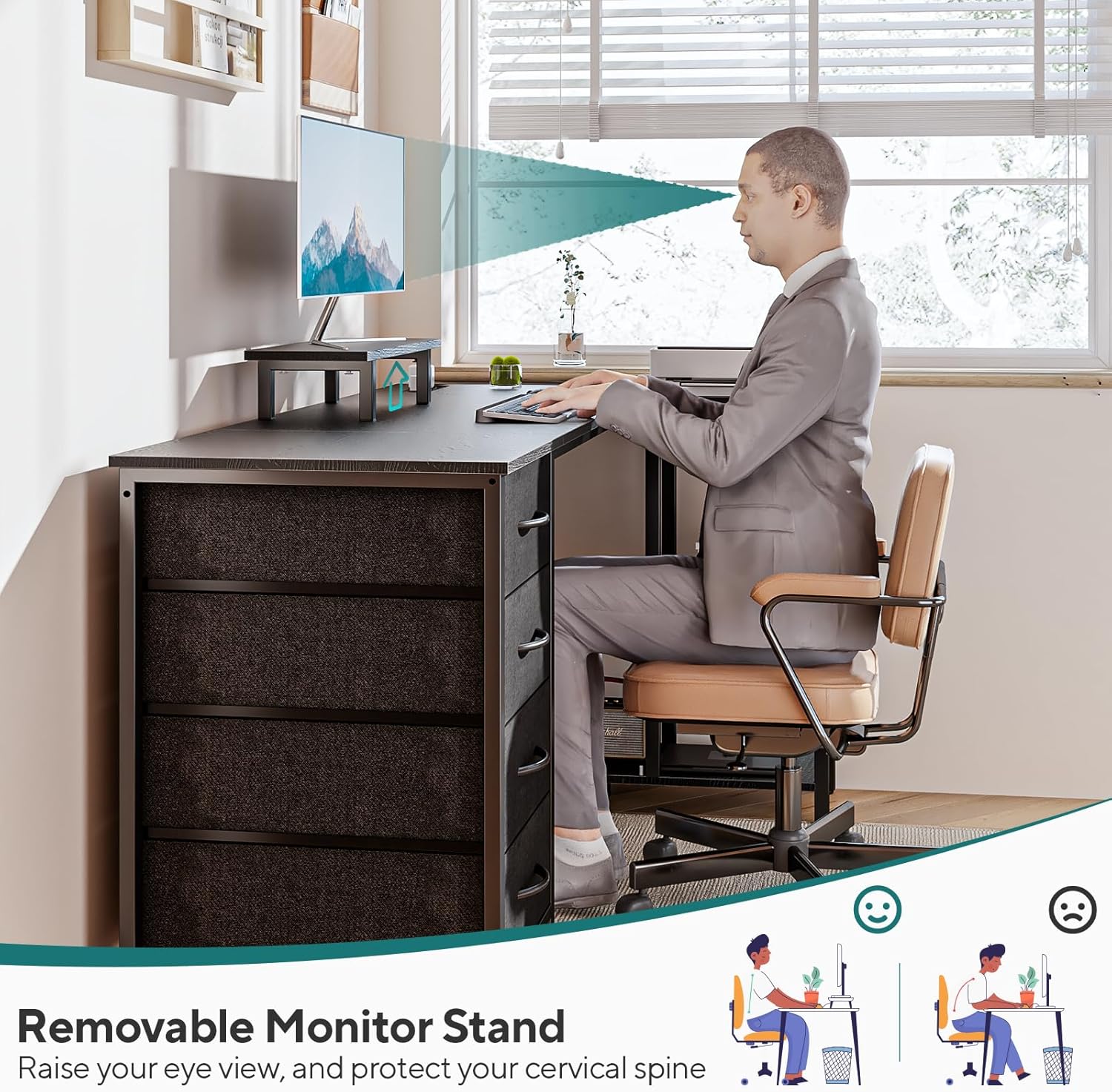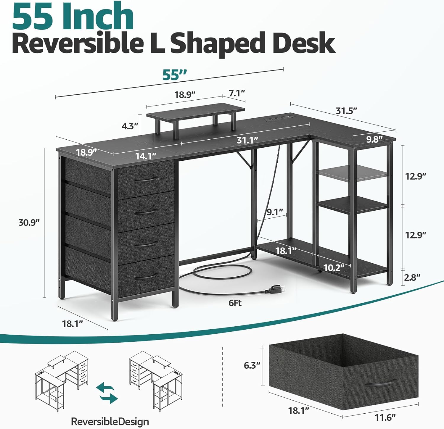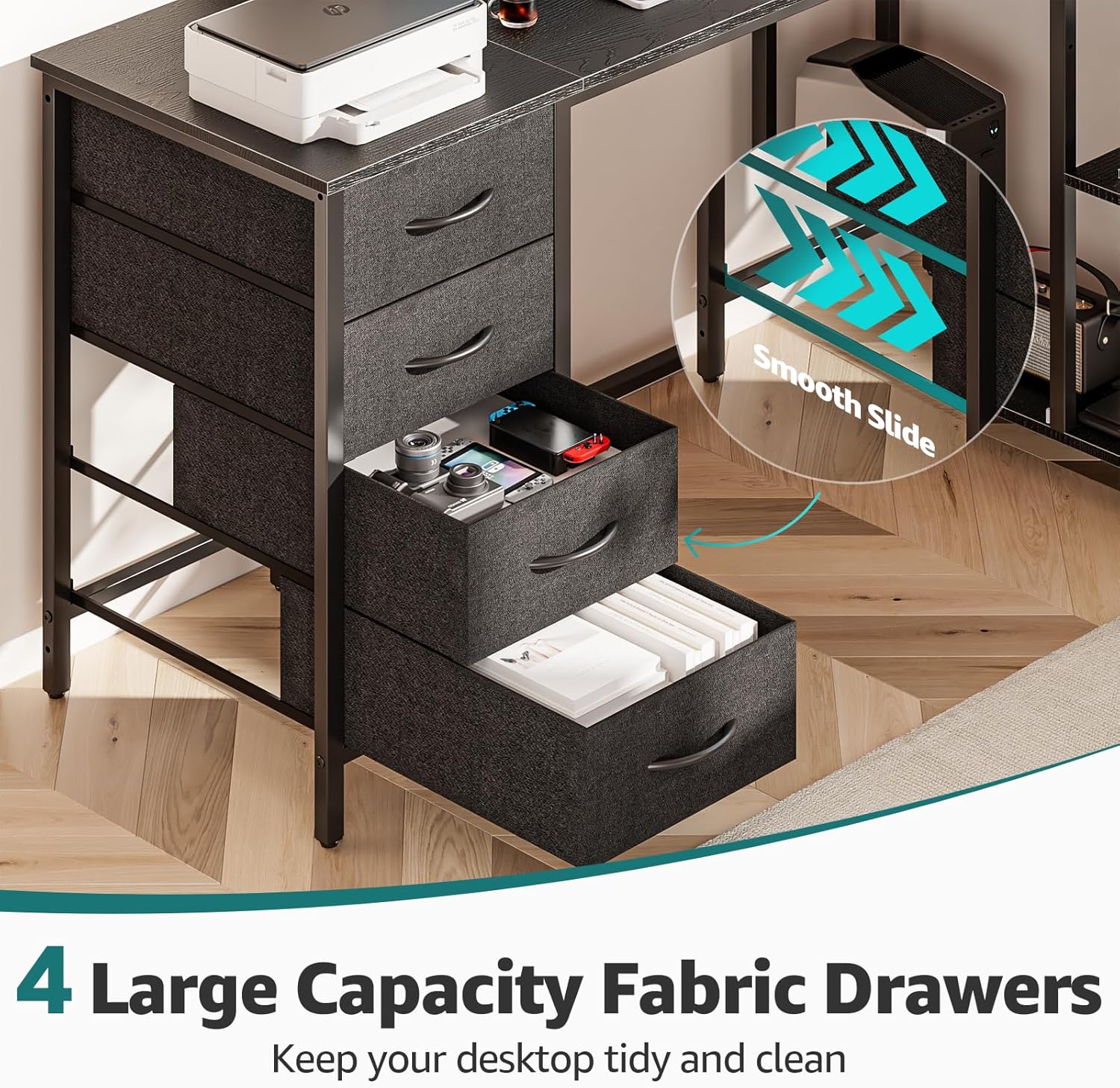 【Multiple Storage Spaces 】Our l shaped computer desk with drawers and shelves come with multiple storage spaces to keep your room neat and organized. Say goodbye to clutter as you can keep your files in the 4 deep and wide fabric drawers or on the storage shelves. You can also place your mainframe in the spacious stand so you have plenty of legroom for a comfortable work experience