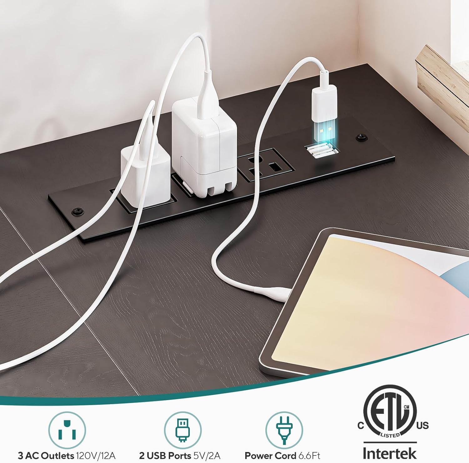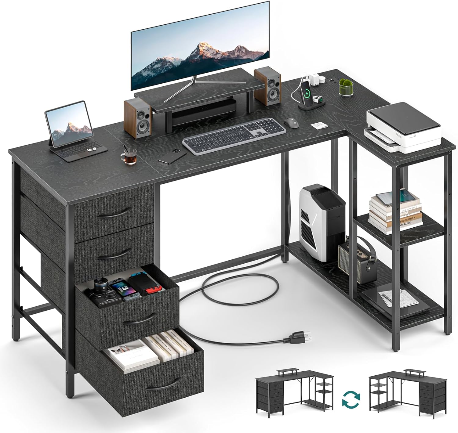 【Safe Built-In Power Outlet】This L Shape Computer Desk with drawers comes with an ETL-certified power outlet that includes 3 AC power outlets and 2 USB ports. When you’re focused on your work, the outlets at your fingertips allow any electronic device to charge right next to you without crawling under the desk or getting up several times to find power