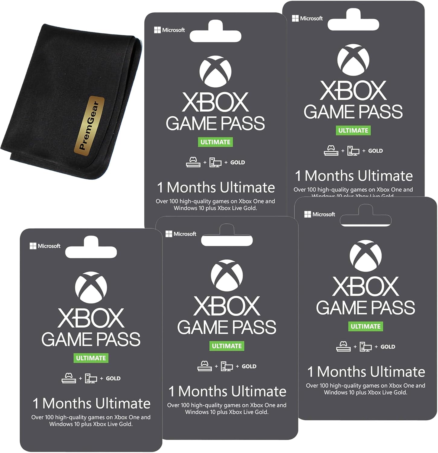 XBOX GAME PASS ULTIMATE (5x 1 month, total 5 Months): includes Xbox Live Gold and over 100 high-quality games. Play games solo or with friends on console, PC, phones, and tablets. There’s always something new to play with Ultimate. (Physical Card – 25 digit redeeming code, printed on back of card). Also included is a PremGear Quality Cleaning Cloth (for LCD screens on all your digital devices as well as optics)