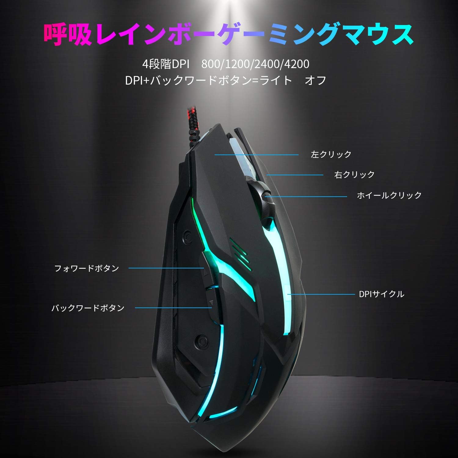 Wired Gaming Mouse—-The USB wired gaming mouse has a high-precision sensor and low-friction PTFE feet to give you precise and smooth control. Four levels of DPI (dots per inch) can be easily switched (800/1600/2400/3200). 6 buttons (2 side buttons). Long press the DPI button to switch between 7-color breathing/red light. Gaming mouse size: 5.23*2.75*1.57 inches