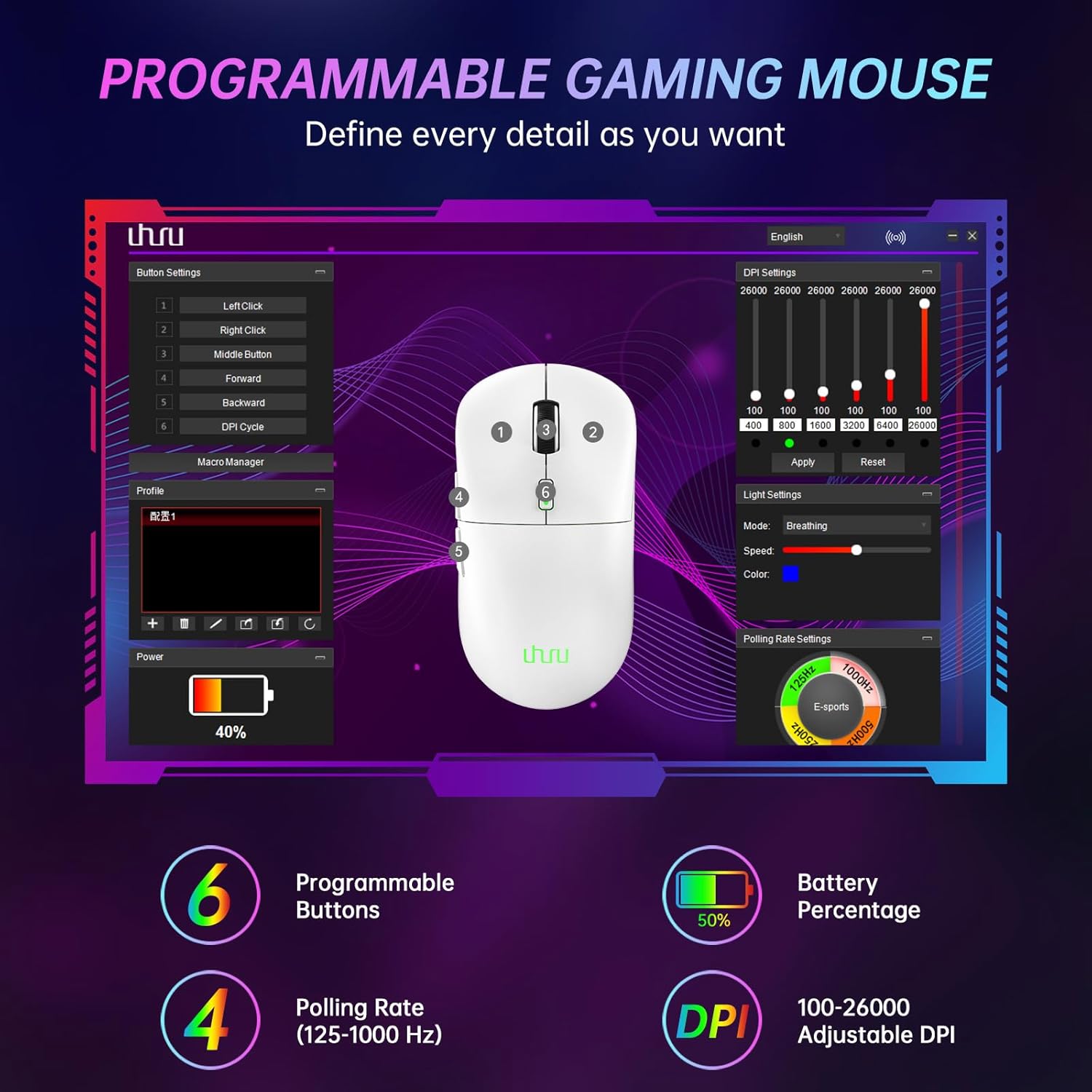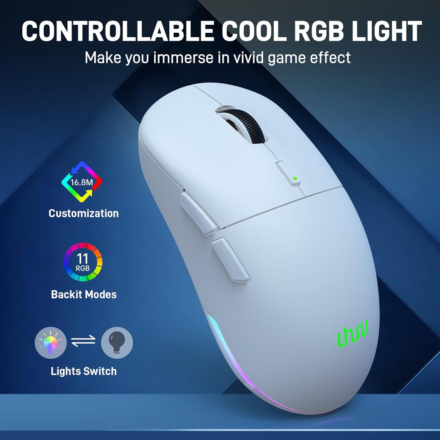 【11 COOL RGB LIGHTING MODES】The UHURU wireless gaming mouse features color wave effects that are customizable across 16.8 million colors. Install the UHURU software to choose from preset colors and RGB backlight effects. It is perfect for matching your setup and specific games, creating a more immersive gaming experience.