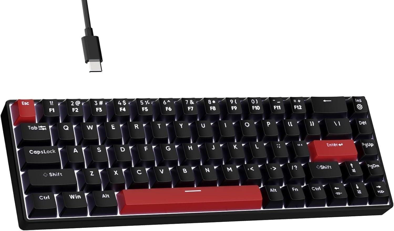 【Full Anti-ghosting Keyboard】All 68 keys are conflict-free, FN+Win can lock the win key to prevent accidental touch. Black and red mix and match design, thickened bracket feet with a layer of rubber at the bottom, let you type more stable, detachable USB cable, practical and beautiful.