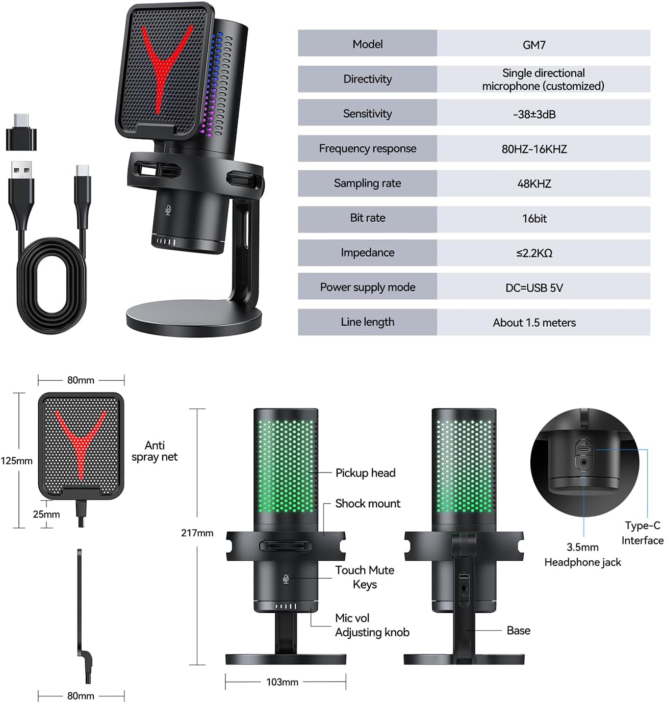【Package Includes】USB gaming microphone x1, sturdy stand x1, pop filter x1, shock mount x1, USB-C to USB-A/USB-C cable x1, user manual x1.