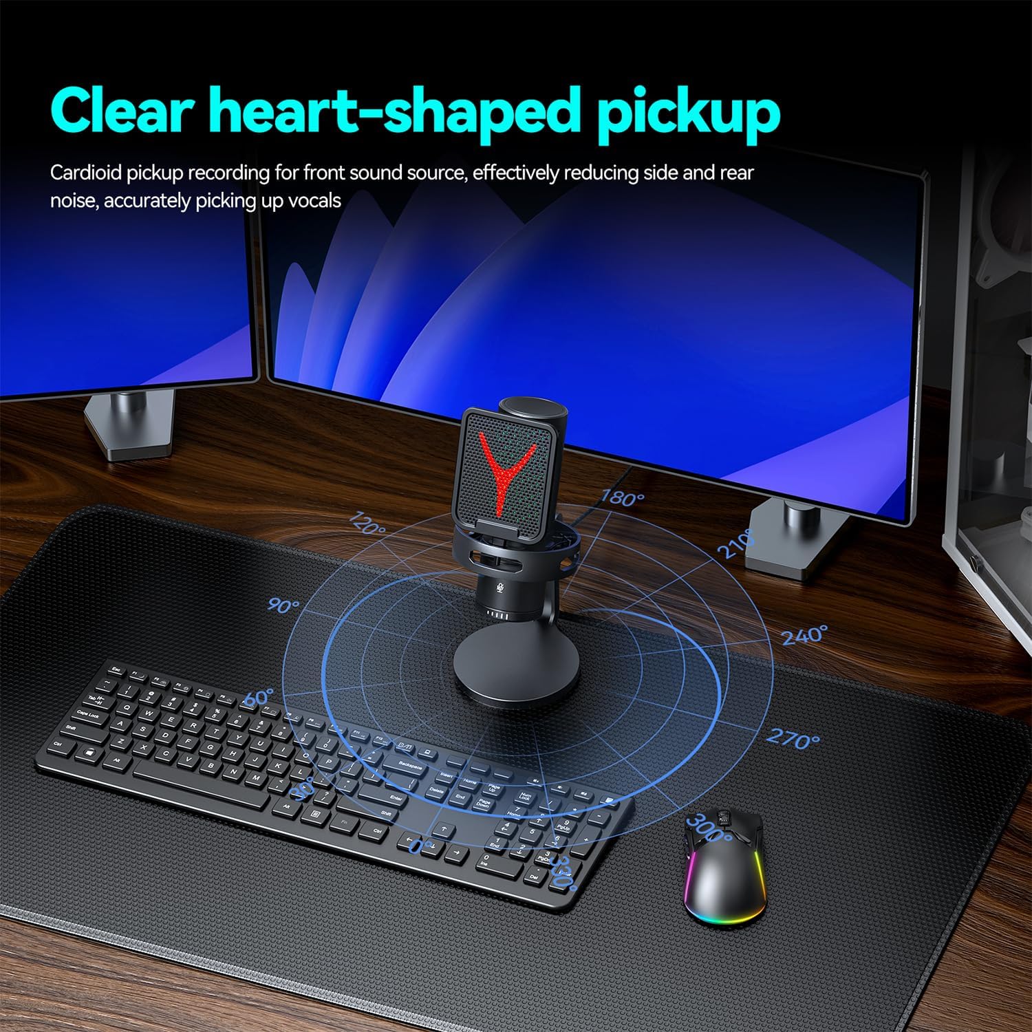【Gradient RGB & Quick Mute】Bicolored RGB lighting alters five color modes itself gradiently. The RGB microphone adds carnival atmosphere with light-up computer setups, putting you in the fierce game arena. You can immediately mute USB gaming mic when you concentrate on the game via the handily quick mute button. RGB LED is off when the studio microphone gaming is muted to tell you working status. Prevent your streaming from accidents caused by forgetting to mute USB PC microphone gaming.