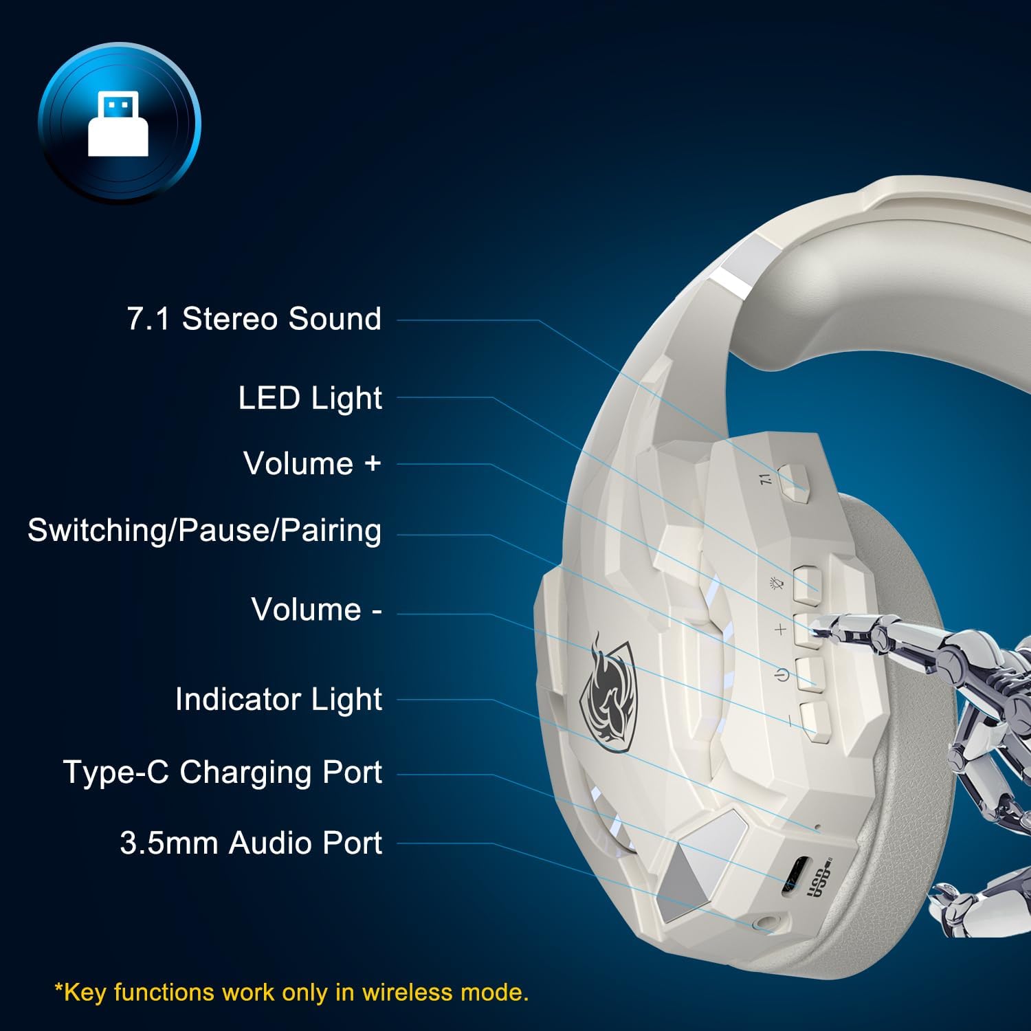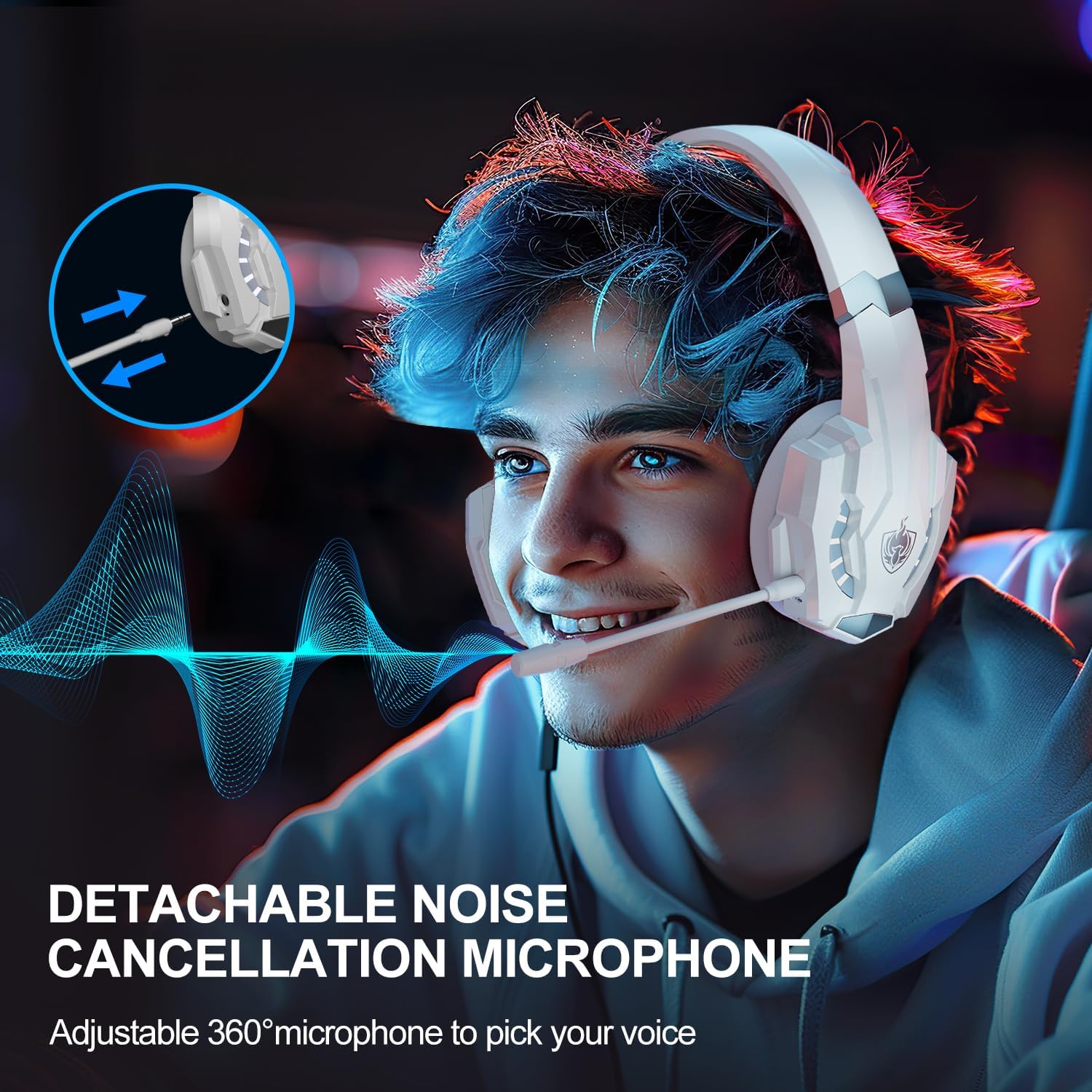PHOINIKAS Wireless Gaming Headset for PC, PS4, PS5 Wireless Headset with 7.1 Stereo Sound, G9000 Wireless Gaming Headphones with 40H Playtime, Noise Cancelling, 3.5mm Wired, LED Light (White)