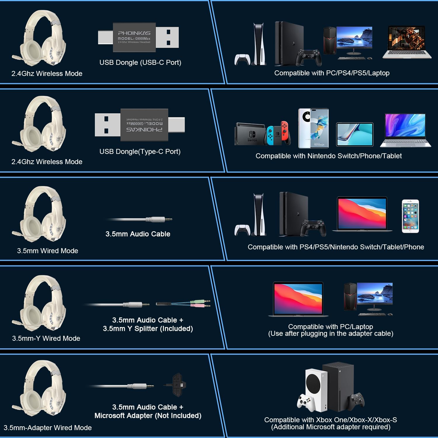 NOTE: ①All Xbox series only support 3.5mm wired mode, non-3.5mm ports require additional adapters. ② Lights are only available in wireless mode.