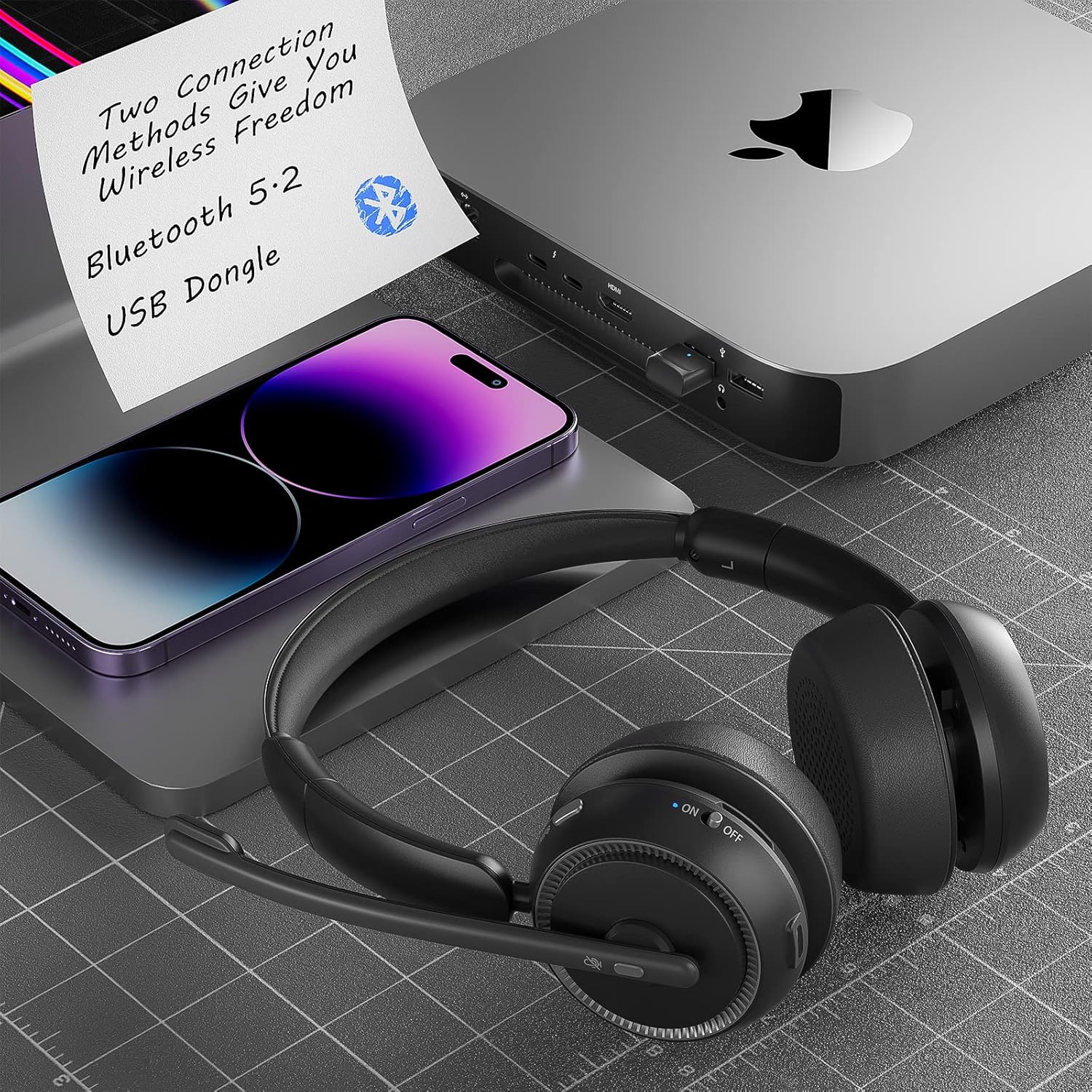EXTREME COMFORT and EASILY MUTE: Wireless headset for work features an ergonomically adjustable headband filled. Specifically designed to reduce stress, our headbands and earcups contain ultra-soft memory foam for gentle cushioning. Meanwhile, the flexible earcups rotate to move whenever you do, and provide enough space for your glasses. Additionally, the mute button on the side of the earcup allows for easy silencing during voice chats or meetings, ensuring you only speak when ready to be heard