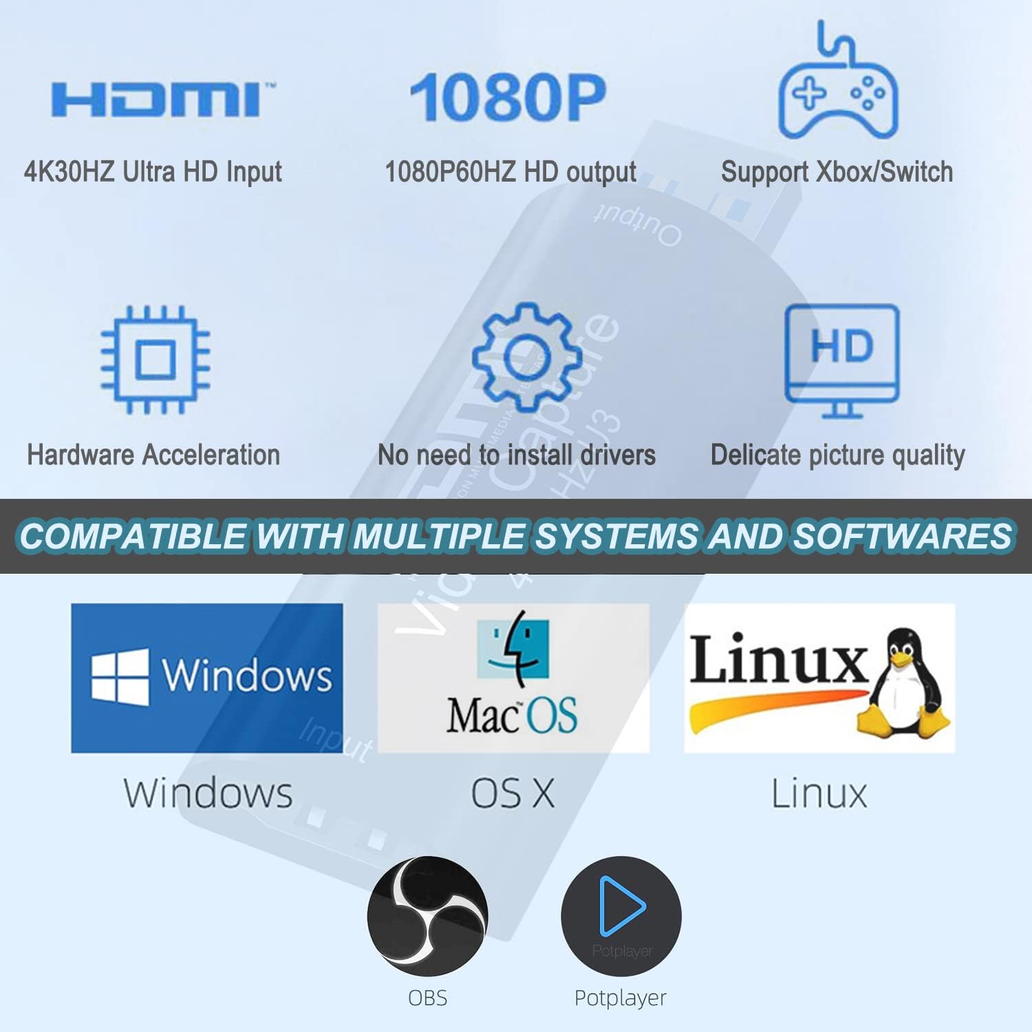 [Real USB3.0 1080P 60Hz uncompressed video capture card] Insert the video capture card into the USB3.0 socket of the PC, adjust the resolution of the captured device to 1080P/4K 16:9 to enjoy clear video recording, gaming live streaming, conference live broadcast. Support HDMI input upto 4K 30FPS and USB3.0 output (capture) upto 1080P 60Hz video and stereo. It is recommended to use OBS studio