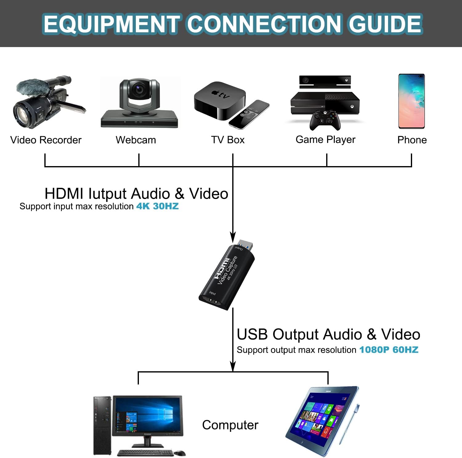 HDMI Input resolution 4K 30FPSUSB output resolution 1080P 60FPSVideo output format: YUV/JPEGSupport video format: 24/30/36bit Deep color; audio format: L-PCMSupport most acquisition software, such as VLC / OBS / Amcap, etcSupport Windows / Android / MacOSConform to USB Video and UVC standard; USB Audio UAC standardMax working current: 0.2A/5V DCDimension (L * W * H): 52x25x14 (mm)Without external power supplyNo need to install additional drivers.