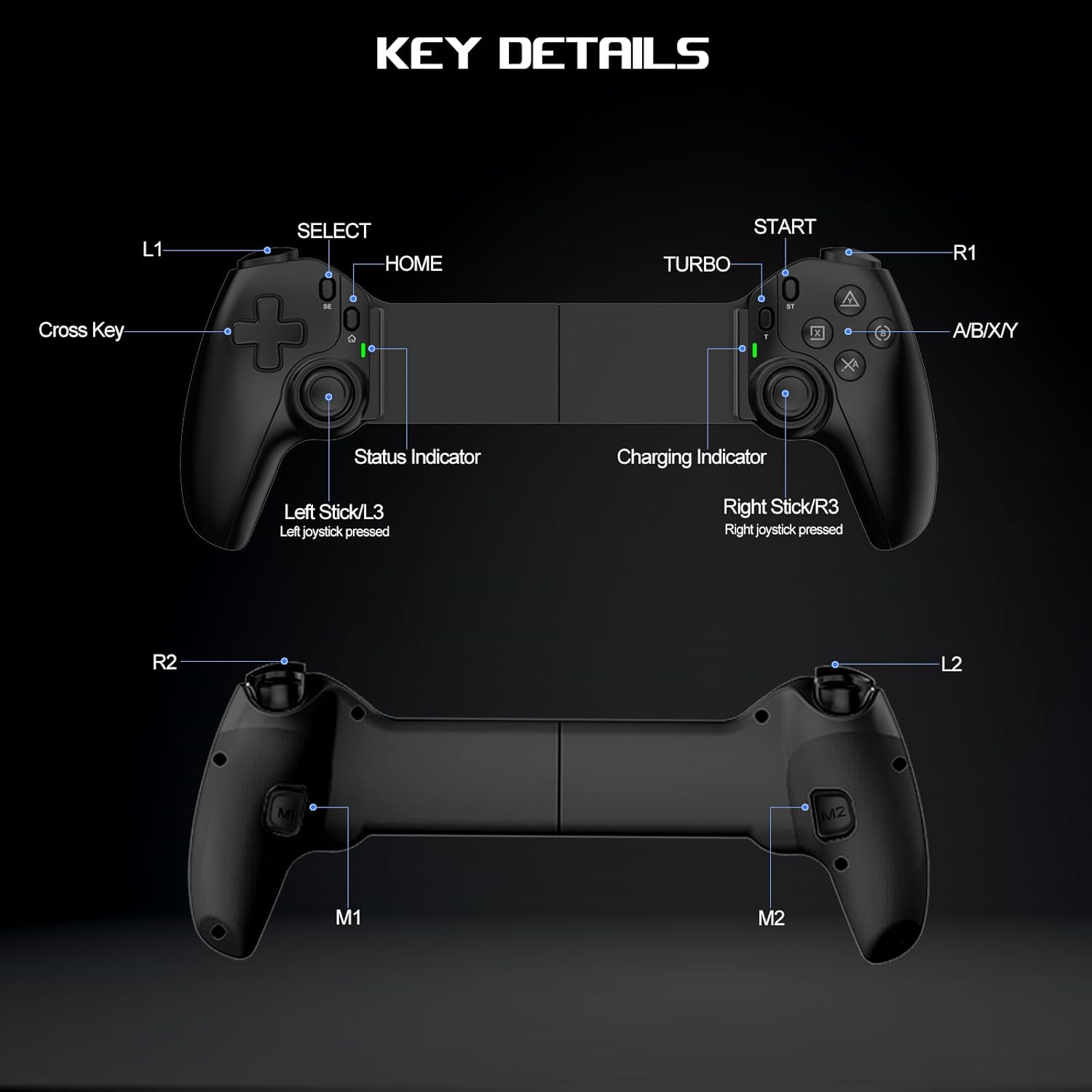 Name Wireless Gaming Controller for iOS Android PC Switch PS4 Size 27*12*6.7cm Weight 252g Product List 1x Mobile Game Controller for iOS Android PC Switch PS4; 1x Type c Charging Cable; 1x user manual For iOS 13.0+Systems iPhone Phone game controller for iPhone 16/16 Plus/16 Pro/16 Pro Max/iPhone 15/15 Plus/15 Pro/15 Pro Max/iPhone 14/14 Plus/14 Pro /14 Pro Max/ iPhone 13/13 mini/13 Pro/13 Pro Max/iPhone 12/12 mini/12 Pro/12 Pro Max/iPhone 11/11 Pro/11 Pro Max/iPhone X/XR/XS/XS Max/iPhone 8 Plus/8/7 Plus/7/6 Plus/6 [Not for Apple TV&iPod, Fire TV/TV Box) For iOS 13.0+Systems iPad Wireless gaming controller for iPad 9.7in, iPad 10.2in, iPad mini 7.9in, iPad Air 9.7in, iPad Air 10.5in, iPad Air 10.9in, iPad Pro 9.7in, iPad Pro 10.5in, iPad Pro 11in (No for iPad Pro 12.9in) For Android 6.0+Systems Phone Android game controller for Samsung Galaxy S24 Ultra/S24 +/S24 /S23 Ultra/S23+/S23/S22 Ultra/S22+/S22/S21 Ultra/S21+/S21/Galaxy S20 Ultra/S20+/S20/S10e/S10+/S10/S9+/S9/Galaxy S8+/S8, Galaxy Note20 Ultra 5G/Galaxy Note10/Note10+/Galaxy Note9/Note8/Galaxy Z Fold5/Galaxy Z Flip5/Galaxy Z Flip4/Galaxy Z Flip3 5G/Galaxy Z Flip/Galaxy A54 5G/Samsung W24 Flip, for Huawei P30/P30Pro/P50 Pro/P40Pro+/Mate 40/Mate 40 Pro/P50 Pocket/Mate 40E; nova; One Plus, TCL, oppo, motorola, Vivo and more android phone. For Android 6.0+Systems Tablet Tablet controller for Samsung Galaxy Tab S 7 11in, Galaxy Tab S8 11in, Galaxy Tab A 8in/9.7in, Galaxy Tab Active 3 8in, Galaxy Tab A8 10.5in,Galaxy Tab A2 10.5in,Galaxy Tab A T510 10.1in, Galaxy Tab S6 10.5in,Galaxy Tab S5e 10.5in,Galaxy Tab S4 10.5in, Lenovo Tab, Lenovo Yoga Tab 11, Lenovo Smart Tab P10, Nokia T20, Smart Tab, Yoga Tab, HUAWEI MatePad, MediaPad which size is within 5-11 inch. For Win 7-11 Systems Wireless PC controller for MacBook, PC, Notebook, Laptop (If your PC does not have its own Bluetooth function, then you need to buy another Bluetooth receiver(Bluetooth Receiver Hardware Required: Bluetooth 4.2 +) For Nintendo Switch Pro controller for Nintendo Switch, Switch OLED, Switch Lite For PlayStation Wireless controller for PS3, PS4, PS4 Pro, PS4 slim (only supports playing PS4 games on PS5 consoles; No support for playing PS5 games) Support Streaming Support streaming on PS4/PS5/Xbox one/Xbox Series S/Xbox Series X/PC Console. Mobile APP Download: PS remote play/Xbox/Steam Link Support Cloud Gaming Support cloud gaming on iOS/Android mobile or tablet: Nvidia GeForce Now, xbox game pass, Amazon Luna, Google Stadia, Rainway, Moonlight, Arcade Other Function Macro Programming; Turbo; 6-Axis Gyro(for Switch/PC/PS4) ; Vibration(for Switch/PC/PS4); Axis Calibration Function; ABXY Key-value Interchange Function Before Using the Controller (1) Please fully charge the controller before first use. (2)Ensure that the controller is turned off before Bluetooth pairing connection. Please Note Before Playing (1)Under iOS mode, it supports ‘Genshin Impact’, and does not support ‘PUGB Mobile’. (2) Under Android mode, both ‘Genshin Impact’ & ‘PUGB Mobile’are not supported. (3) In ‘Call of duty’ gaming interface,if you’ve received a notice to choose a controller model within ‘PS4,PS5 and XBOX’. Please select ‘XBOX’.