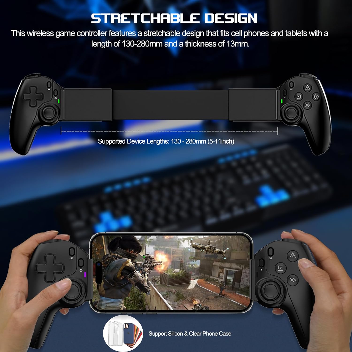 This wireless gamepad with stretch design supports ipad/tablet/mobile phone that is 130-280mm long and 13mm thick (Size supports devices within 5-11inch)Supports silicone phone cases/transparent cases