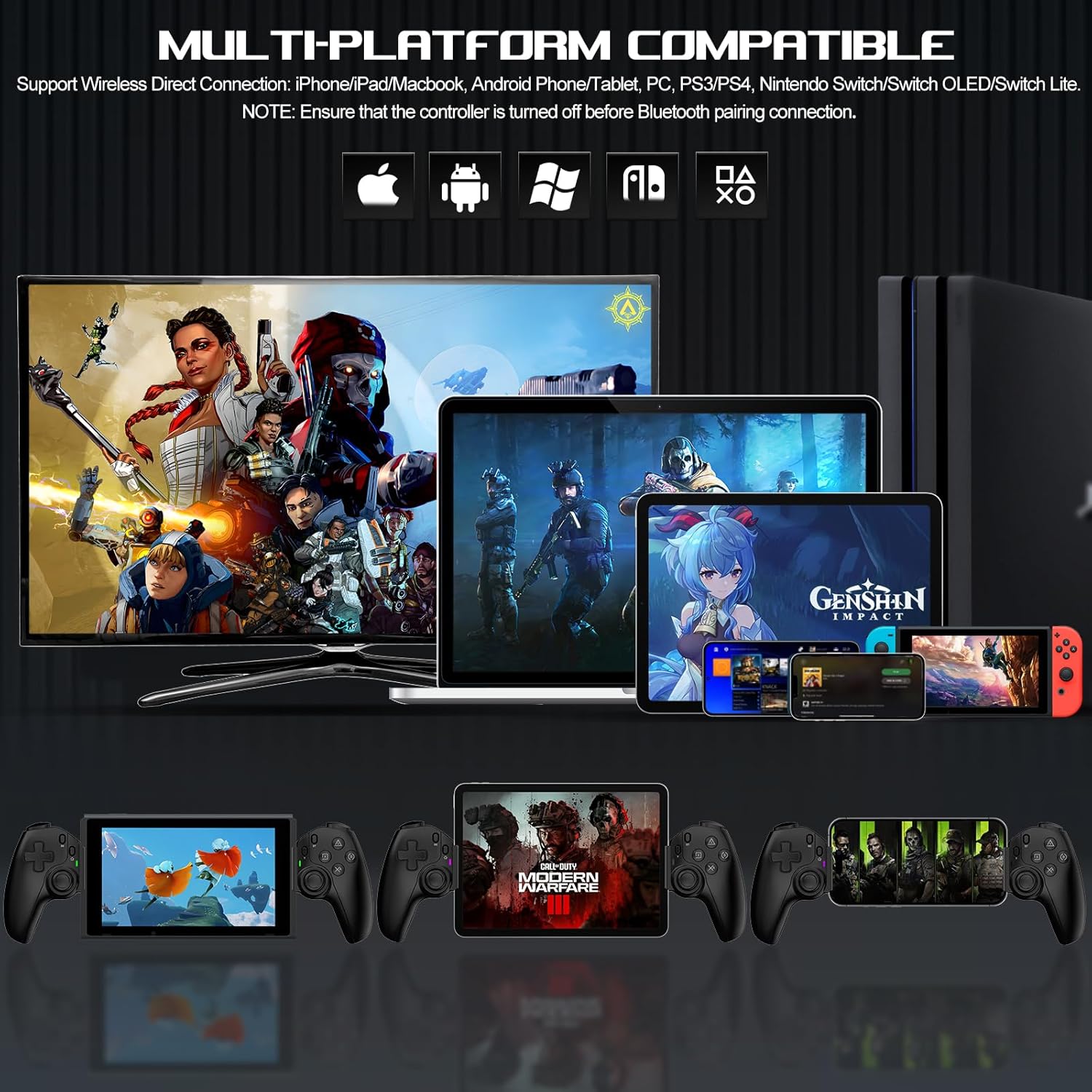 🎮🎮【COMPATIBLE WITH MULTIPLE DEVICES】This wireless gaming controller for iOS 13.0+, Android 6.0+ and Win7.0+systems. Work with iPhone/iPad/Samsung Galaxy series/Galaxy Note/One Plus/TCL/Huawei/Oppo/Motorla and more Android phone/Galaxy Tab S/A/Lenovo Legion Y700/HUAWEI MatePad/Tablet/PC/MacBook/Notebook/Laptop. Compatible with Switch/Switch OLED/Switch Lite/PS3/PS4/PC.