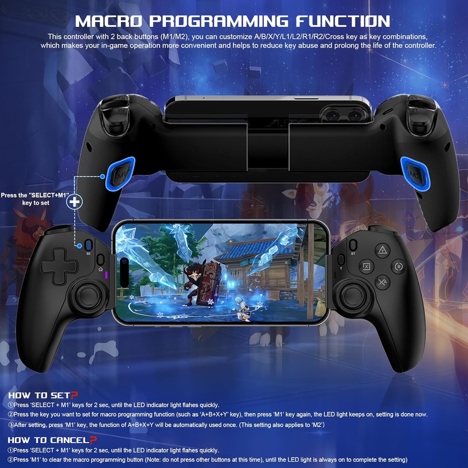 This Android phone controller with 2 back buttons (m1/m2) allows you to create shortcuts and easily perform complex actions, reducing the use of buttons and prolonging the life of the controller.