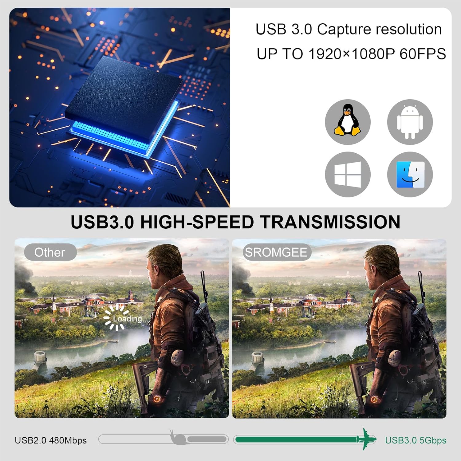 【 PlAY&PlUG】The SROMGEE Video capture card meets UVC and UAC standard,No driver or external power supply required, true PnP. Once plugged in, the device is identified automatically as a webcam. No need to install any driver of capture card switch, you can use any third party software to capture or stream your HD game, or other HD video source. The capture card for streaming works great for recording game play.Detect input and adjust output automatically. Won’t occupy CPU, optional audio capture.