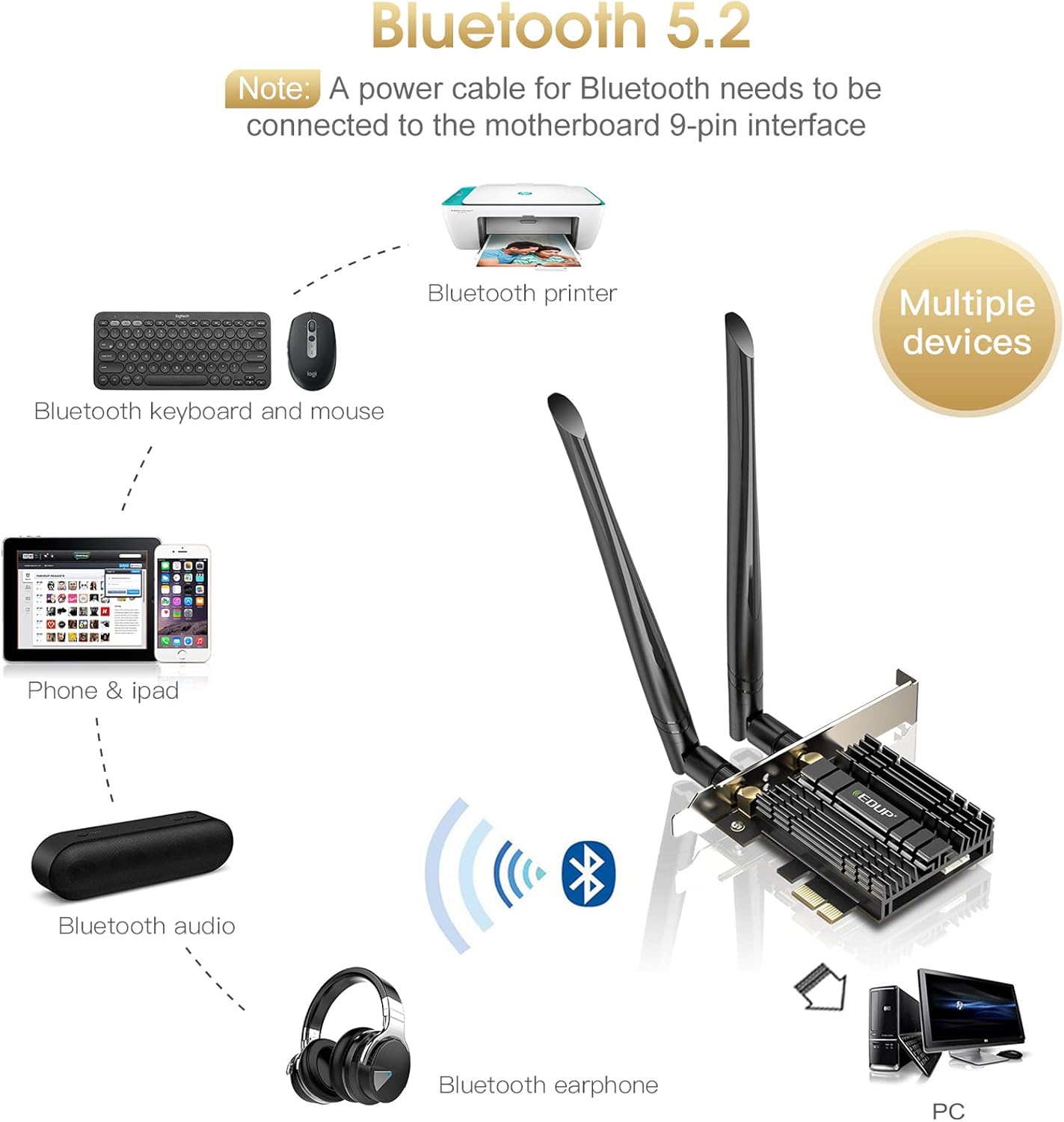 This card can help old desktop to receive wi-fi signal and connect multiple Bluetooth devices ( For example: Bluetooth mouse/ keyboard/printer/speaker and More )