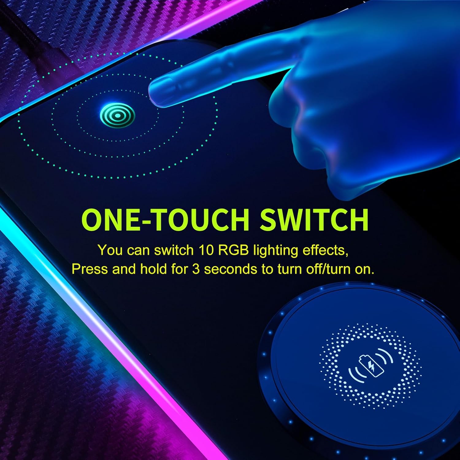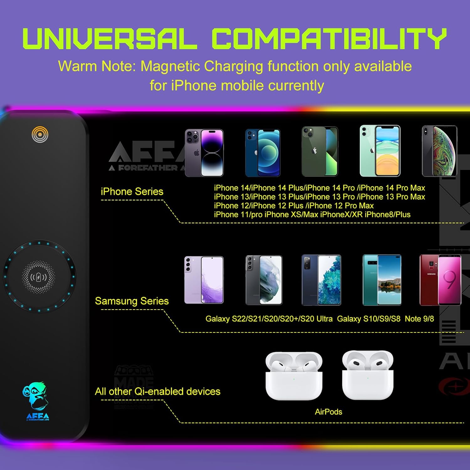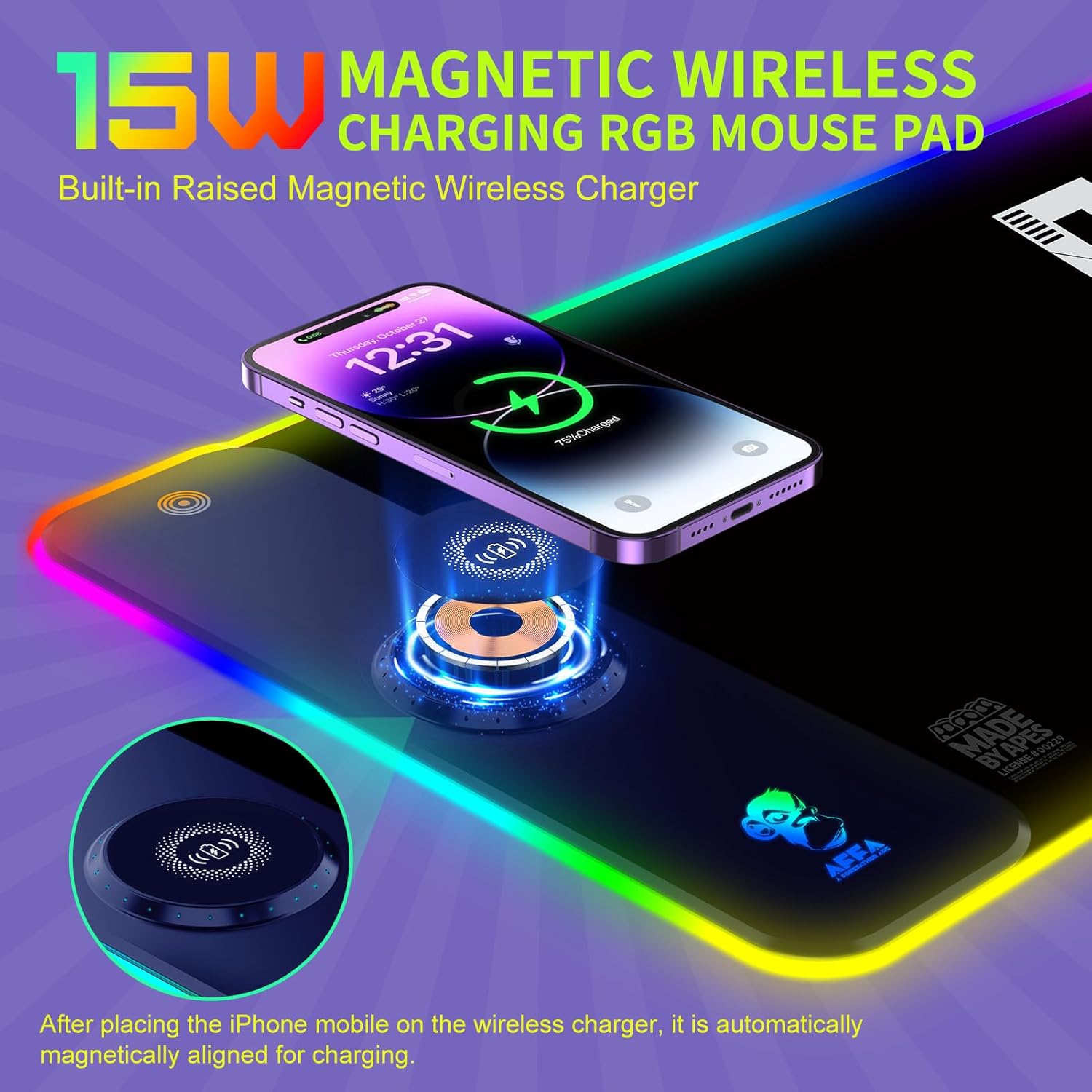 【Built-in Raised Magnetic Wireless Charger】You can easily find the magnetic wireless charger for this rgb gaming mouse pad. The magnetic suction function only supports iPhone Series models, including iPhone 12/iPhone 12 mini/iPhone 12 Pro/iPhone 12 Pro Max, iPhone 13/iPhone 13 mini/iPhone 13 Pro/iPhone 13 Pro Max, iPhone 14/iPhone 14 Pro/iPhone 14 Pro Max/iPhone 14 Plus, and iPhone 15 Series. Once the iPhone is placed on the wireless charging plate, it automatically aligns for convenient charging, greatly improving the speed of wireless charging up to 15W.