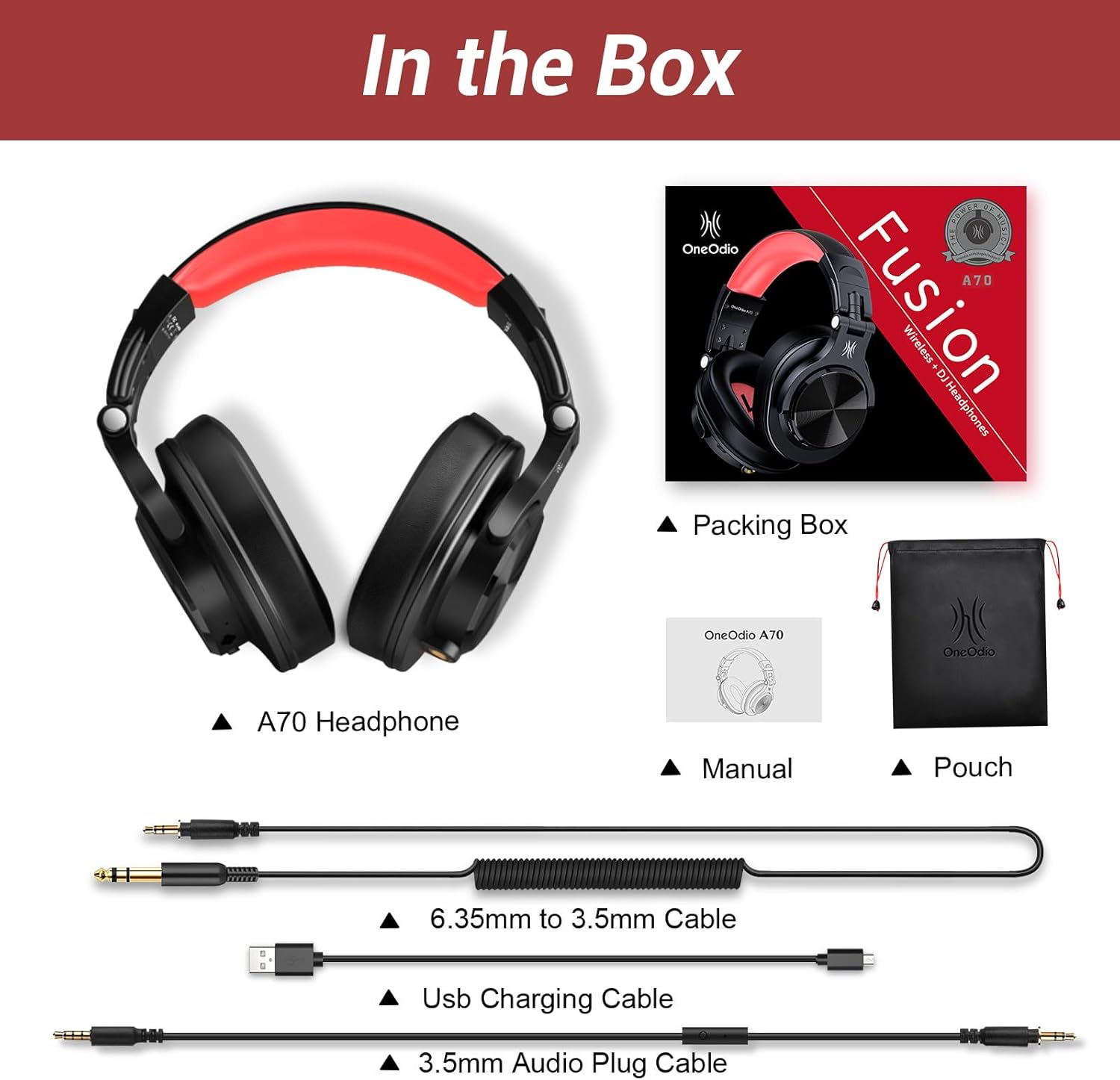 OneOdio A70 Bluetooth Over Ear Headphones, Wireless Headphones w/ 72H Playtime, Hi-Res, 3.5mm/6.35mm Wired Audio Jack for Studio Monitor & Mixing DJ Guitar AMP, Computer Laptop PC Tablet – Red