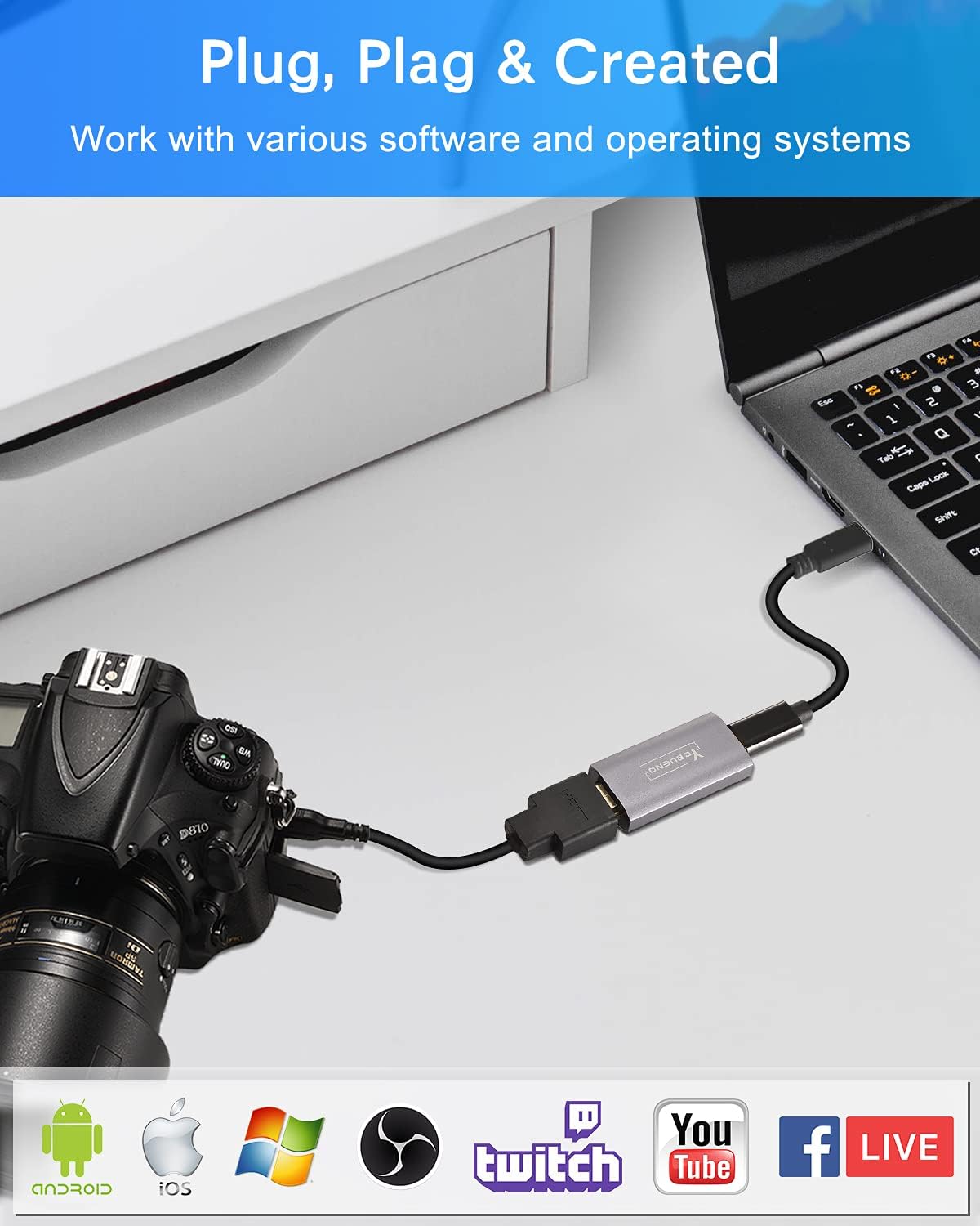【Plug and Play】The video capture card does not need to install a driver, just plug and play, easily connect your DSLR, camcorder, or action Cam to your PC or Mac for game recording, without external power supply, compact and portable, it can take advantage of the functions built into the current software to get a seamless experience.
