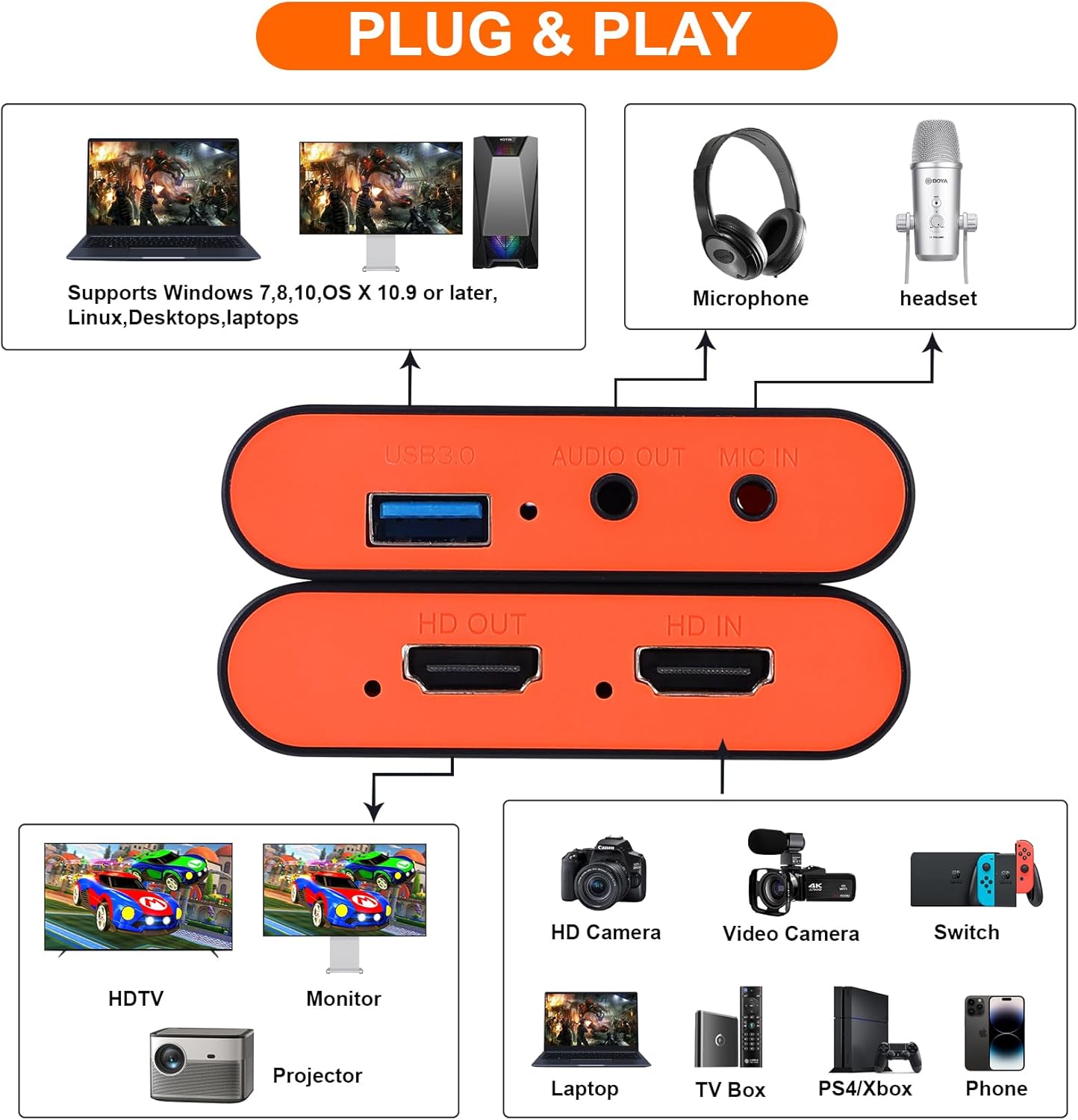 【What will you get】1* Capture Card with 4K Passthrough, 1* USB3.0 Cable, 1* User Manual.