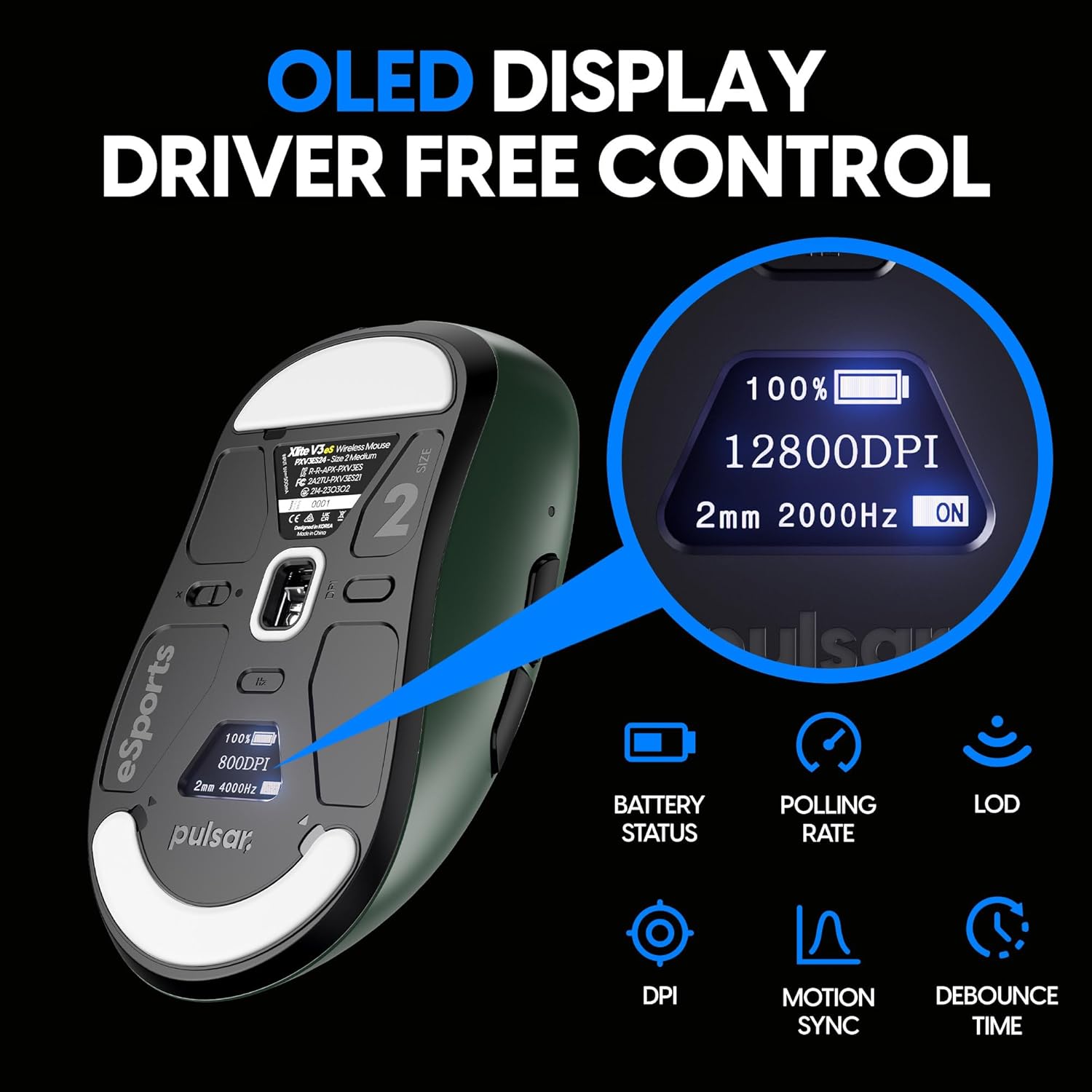 OLED DISPLAY, DRIVER FREE CONTROL – Easily monitor battery levels and adjust key settings, such as LOD, debounce time, motion sync, polling rate, and DPI, using dedicated mouse buttons, all without the requirement for external drivers.