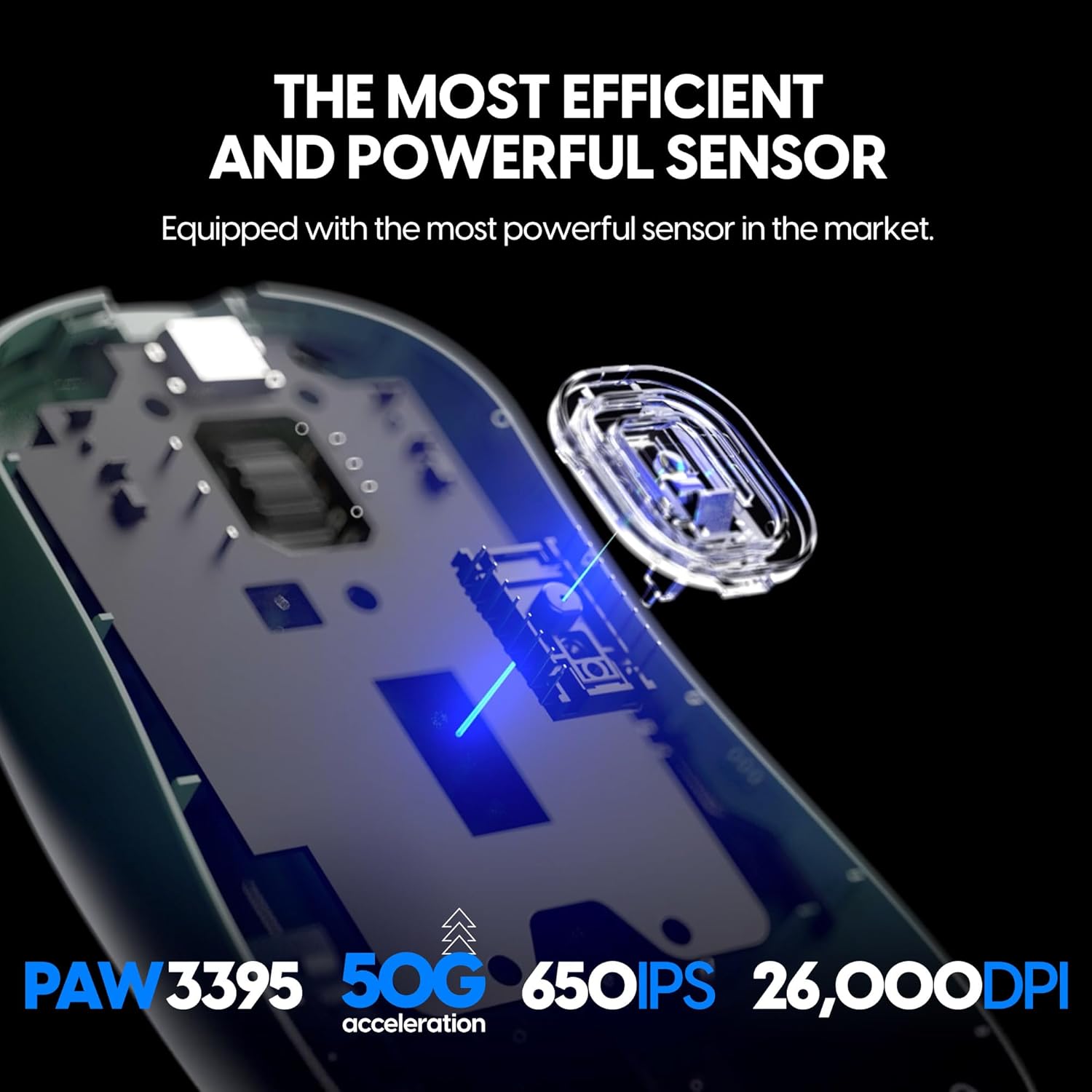 THE MOST EFFICIENT AND POWERFUL SENSOR – PixArt’s cutting-edge PAW3395 sensor, the latest flagship in sensor technology, Nordic MCU, ensuring exceptional power efficiency and precise, rapid processing.