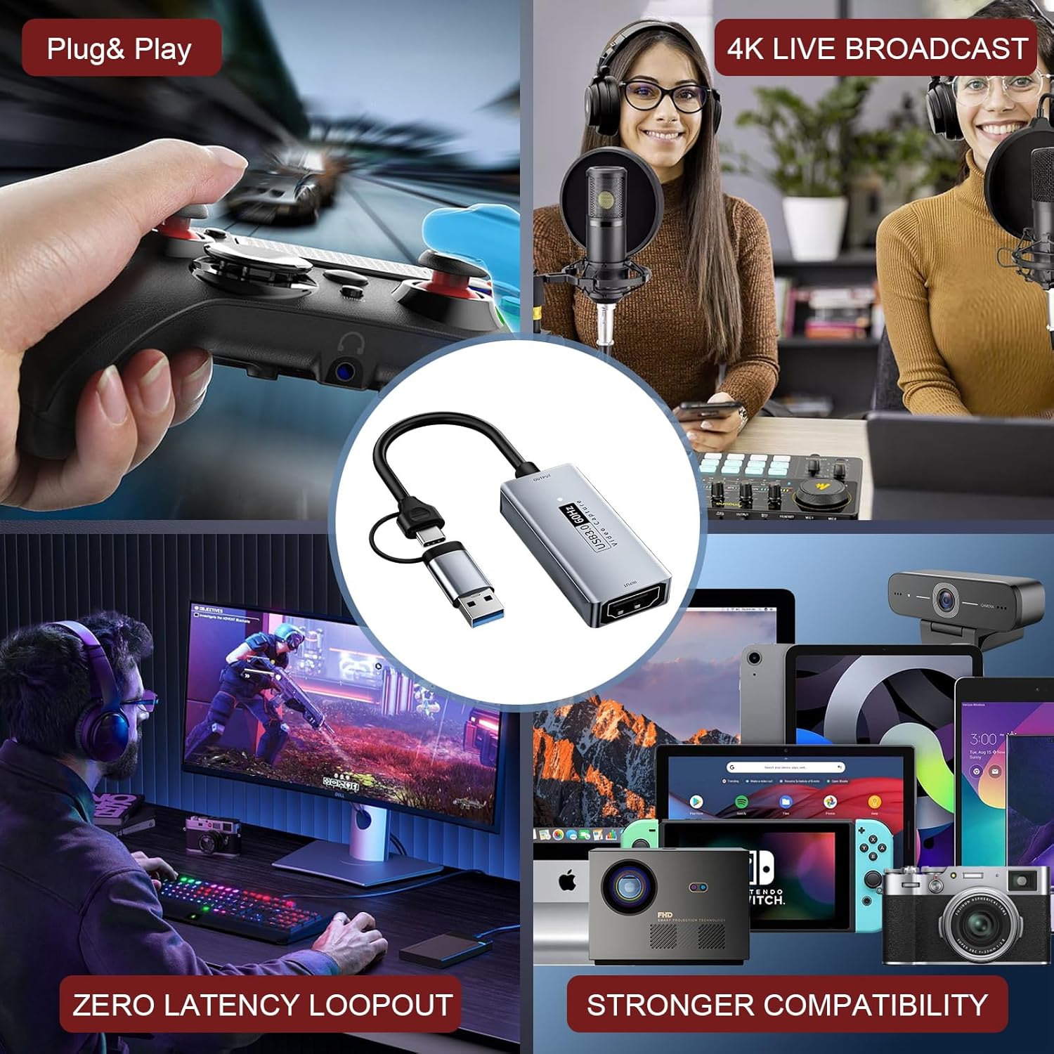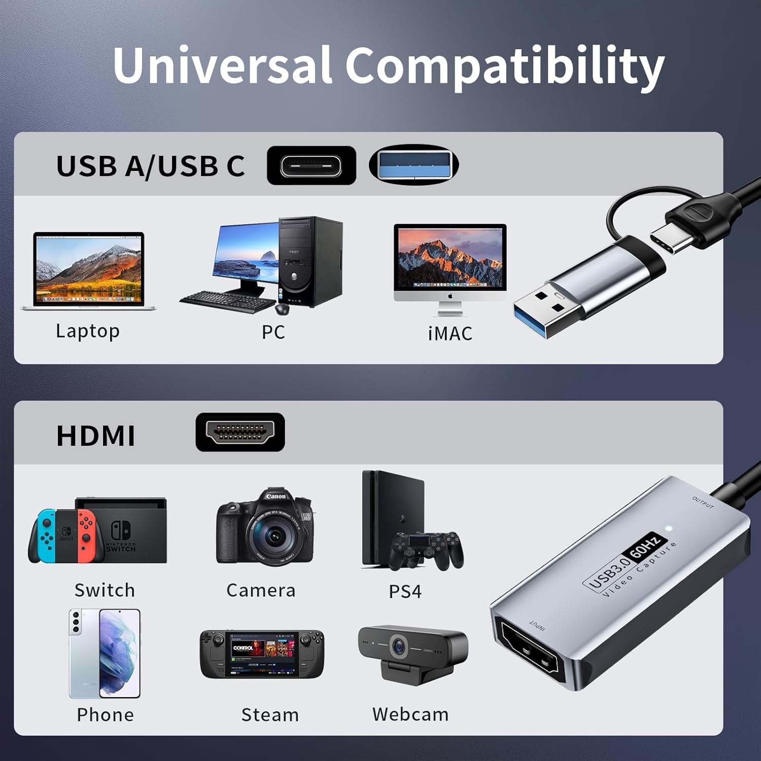 【Wide Compatible】This HDMI to USB/USB C 3.0 capture card easily connects DSLR, camcorder, or action Cam,PS5/4,Smartphones, Switch, XBOX to your PC or Mac, compatible with Windows/Android/MacOS.