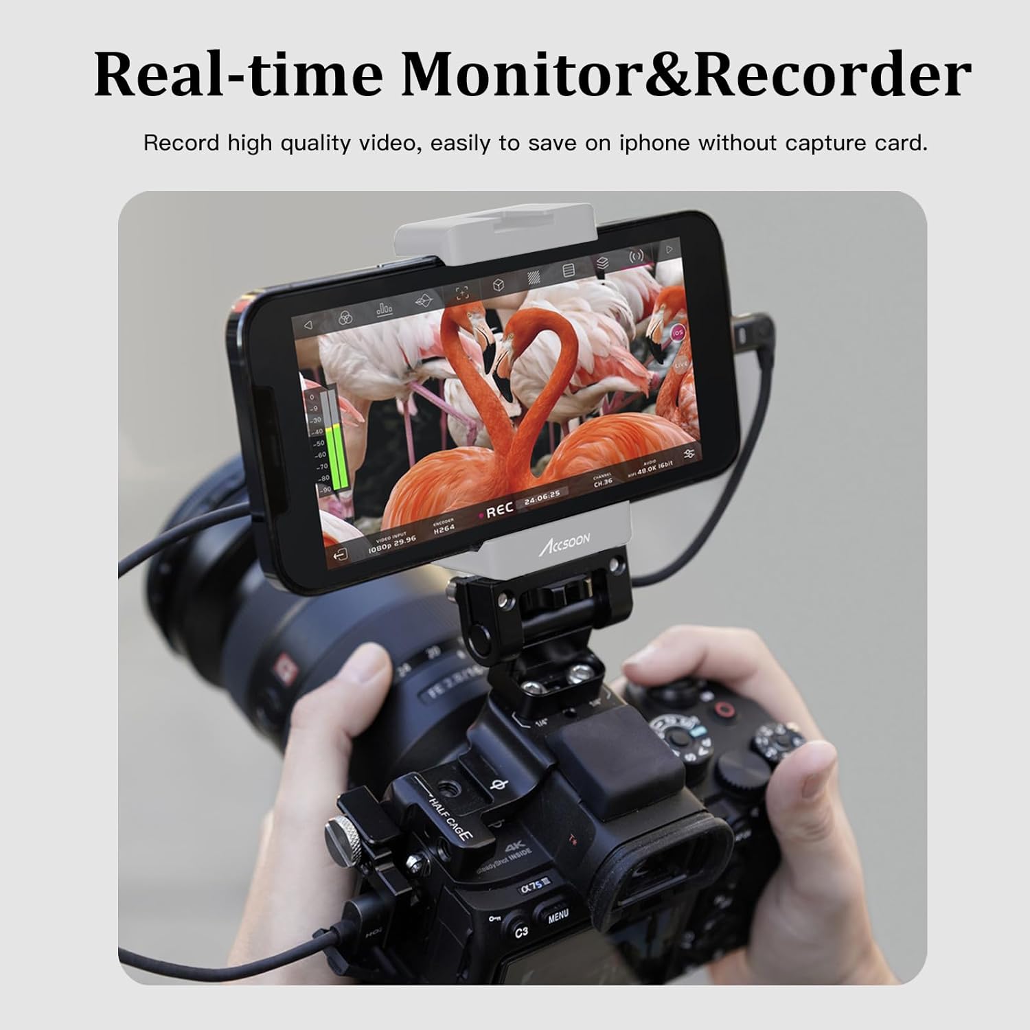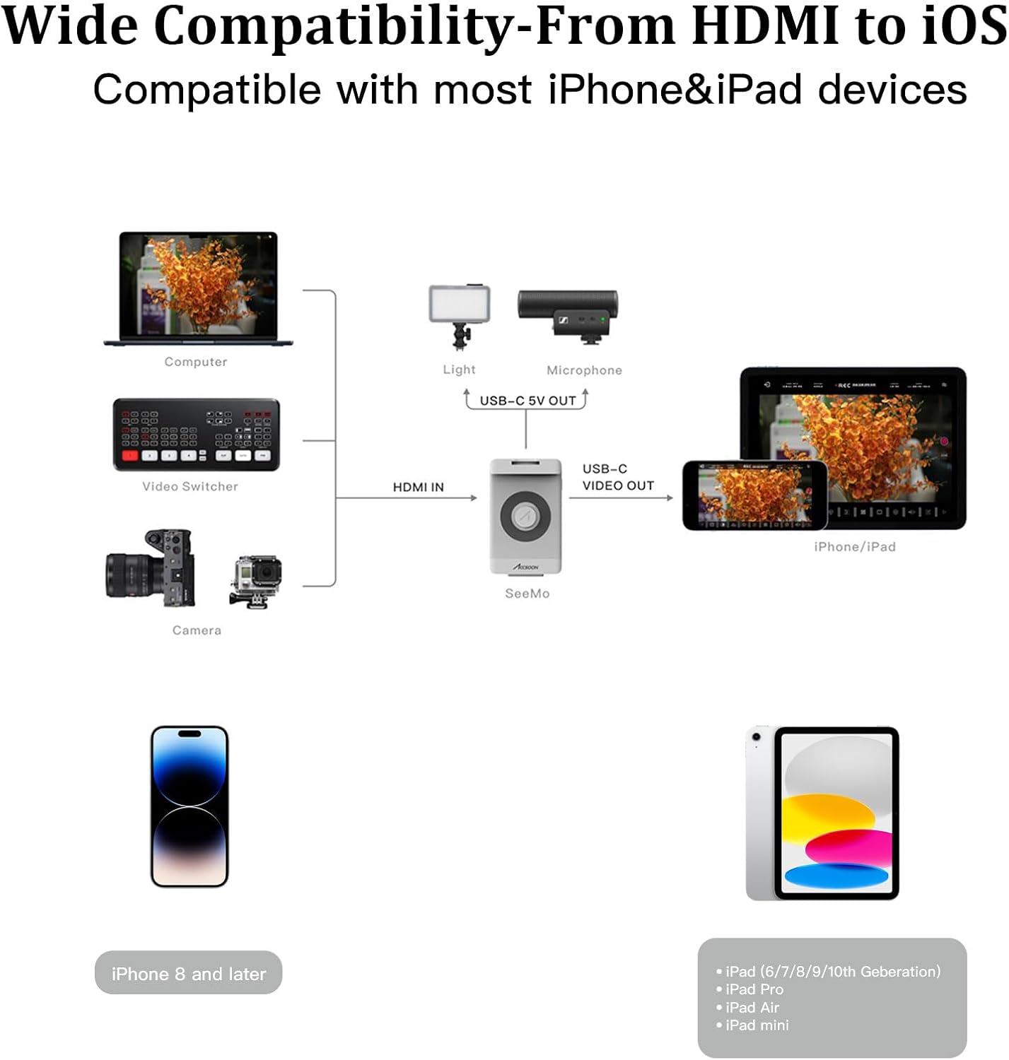 Powerful SeeMo Adapter : Accsoon SeeMo is designed for turning the iPhone/iPad into a monitor, connected with Accsoon SEE App, the iPhone/iPad act as a excellent screen quality and powerful video processing capabilities. It is convenient to monitor and cooperate with cameras.