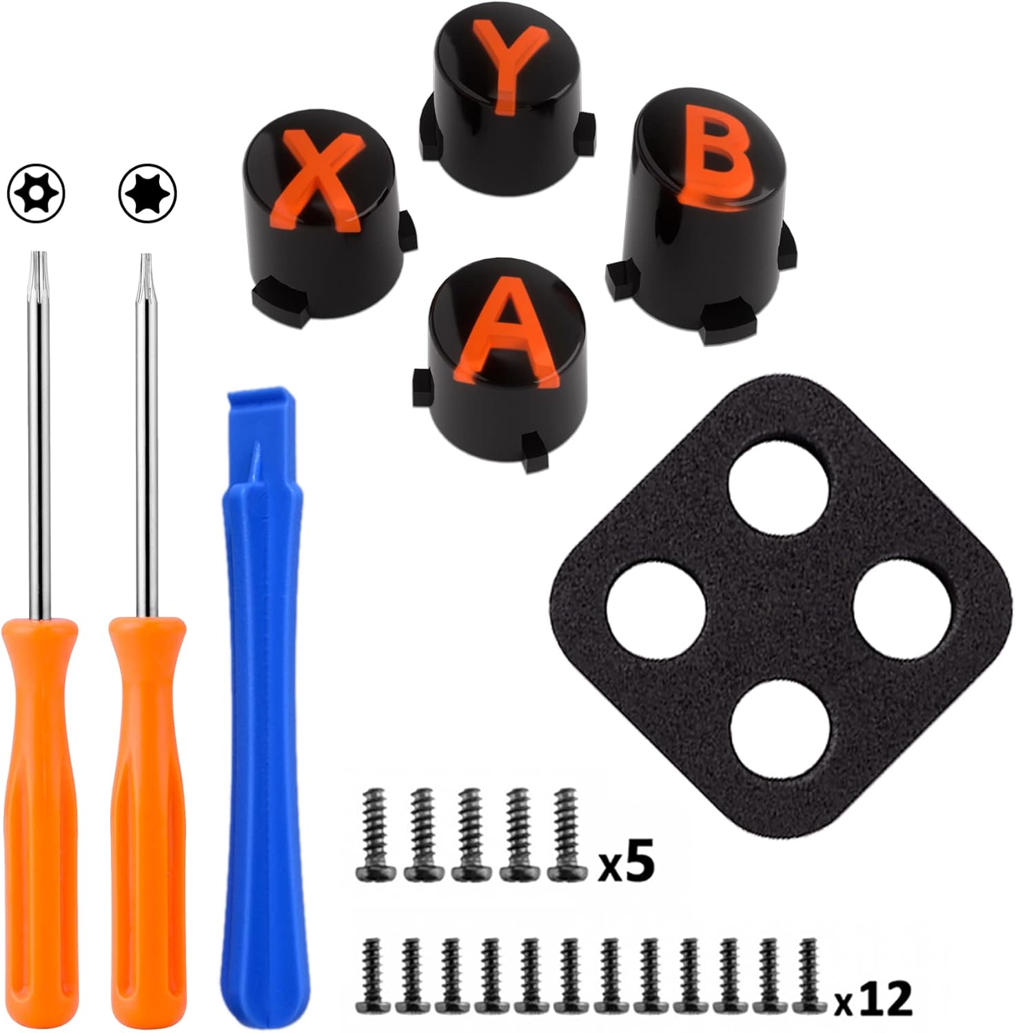 Package includes: 1* ABXY buttons, 1* T8H screwdriver, 1* T6 screwdriver, 1* Open shell tool, and spare screws (The controller, dpad, thumbsticks and other buttons are not included.)