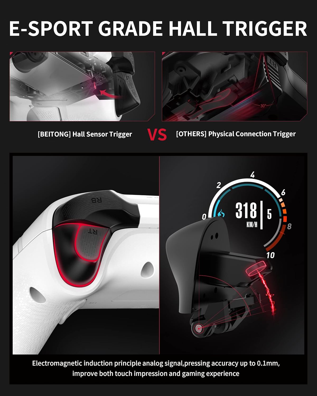 Hall effect sensing trigger,which is drived by electromagnetic induction,pressing accuracy up to 0.1mm,high perfomance and better response,also solves issues such as high friction of traditional physical triggers