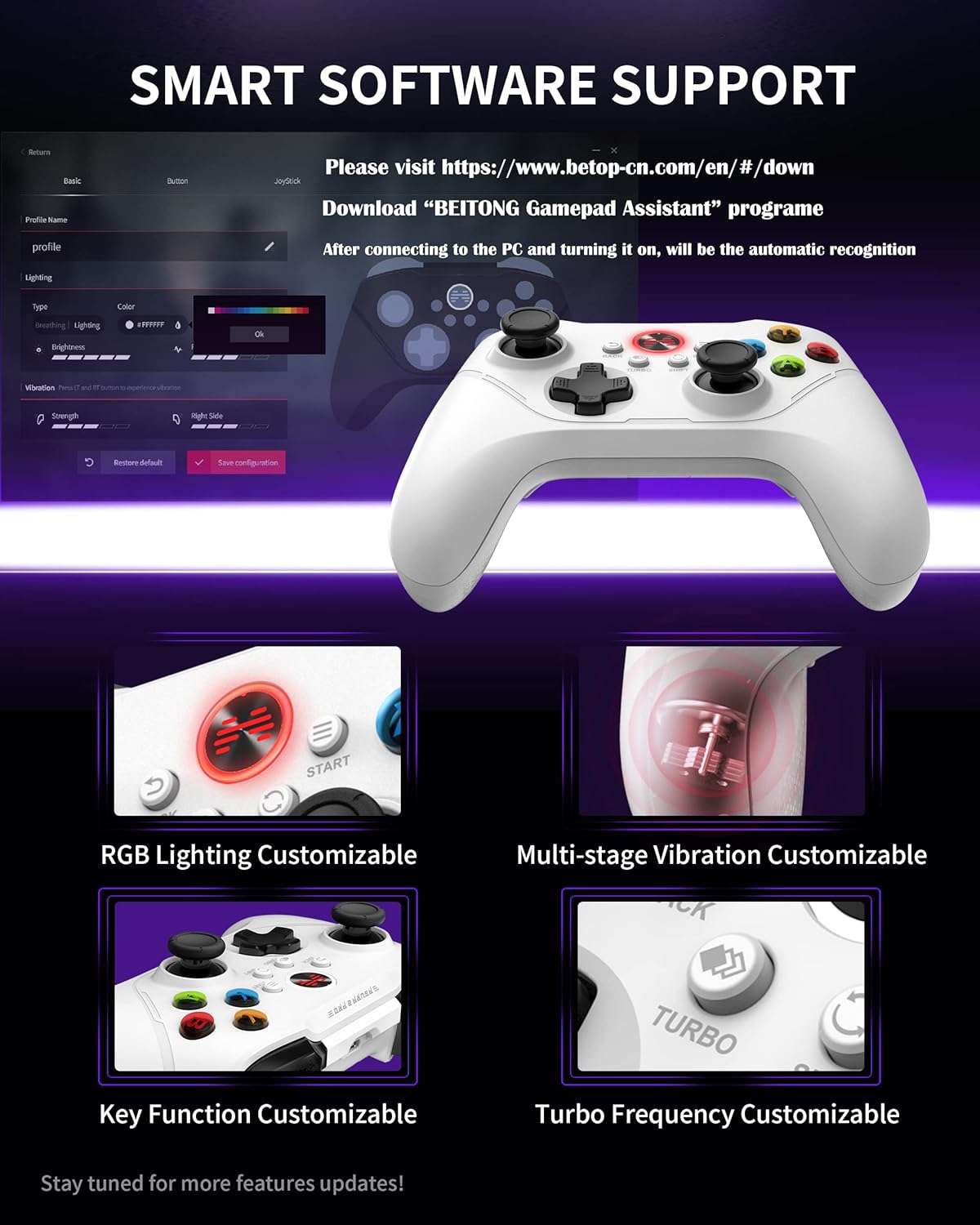 BEITONG Gamepad Assitant Support PC Game Controller Customization: Smart software achieve custom joystick sensitivity and deadzone range-vibration intensity-turbo frequency-key mapping ect.It’s recommended to download according to gamer’s needs,do not affect basic use of the controller without downloading